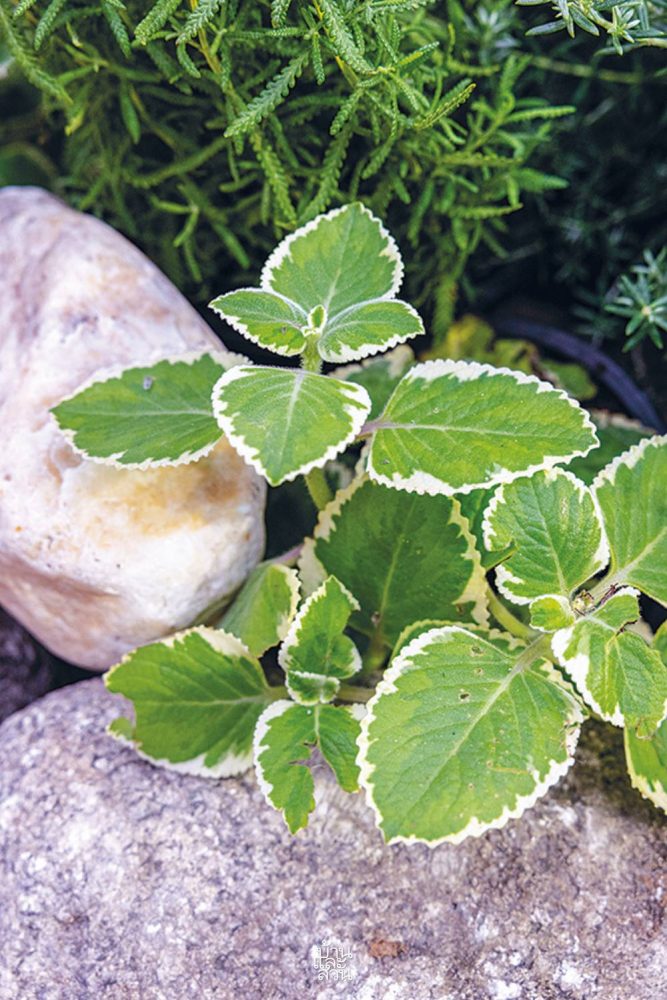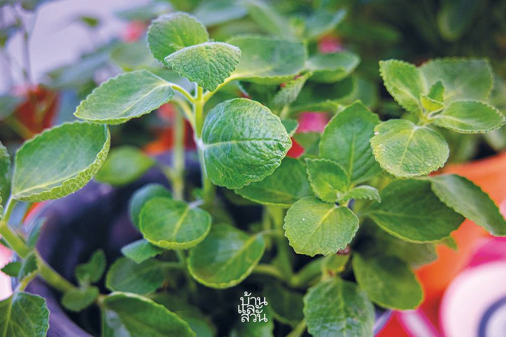 ไม้พุ่มอายุหลายปี ลำต้นทอดเลื้อย ยอดชูตั้ง แผ่นใบหนาอวบน้ำ ทุกส่วนมีขนนุ่มปกคลุมและมีกลิ่นหอม มีทั้งแบบใบเขียวและใบด่างให้เลือกปลูก นิยมกินยอดใบอ่อนเป็นผักสด ให้กลิ่นหอมสดชื่น หากหมั่นเด็ดยอดมากินบ่อย ๆ ต้นจะทอดเลื้อยแตกพุ่มสวยงาม