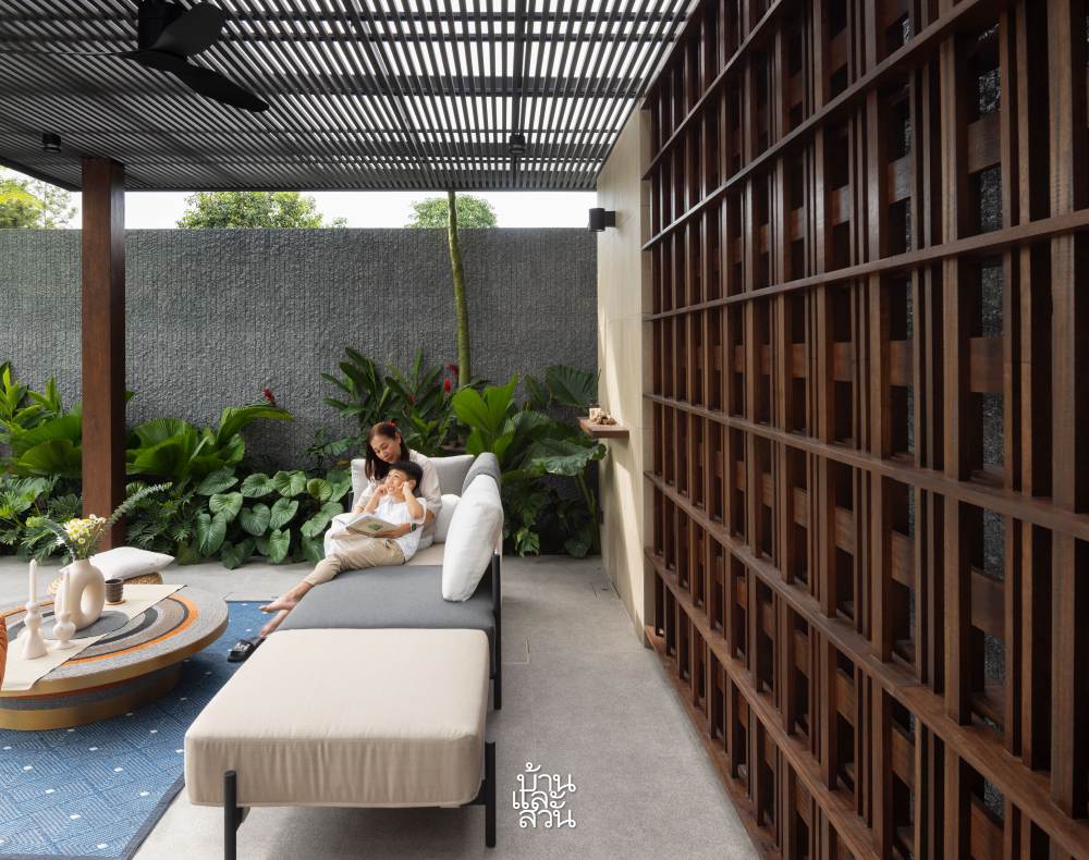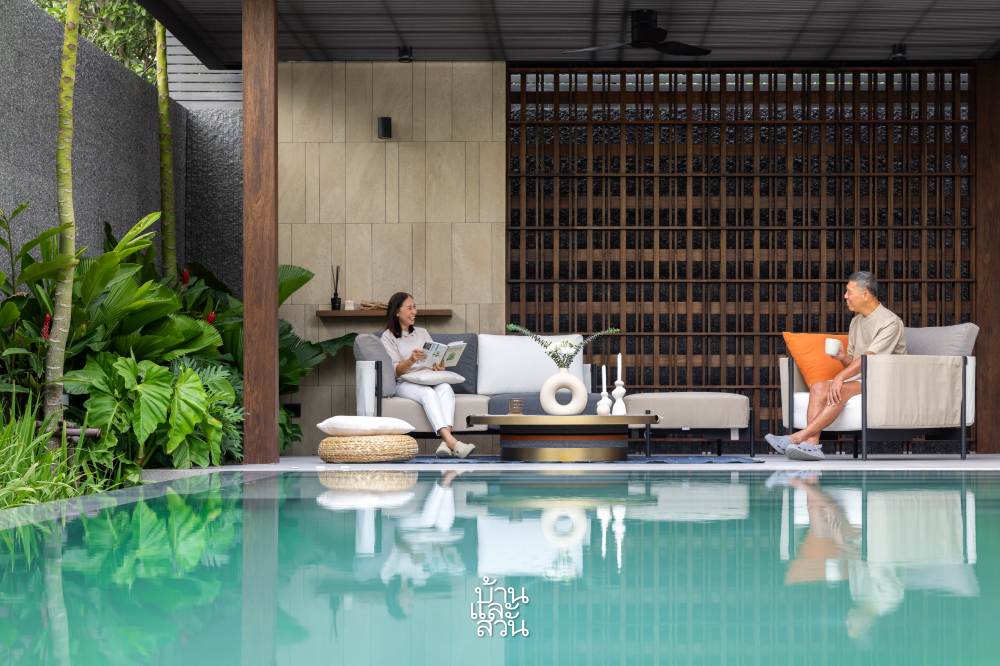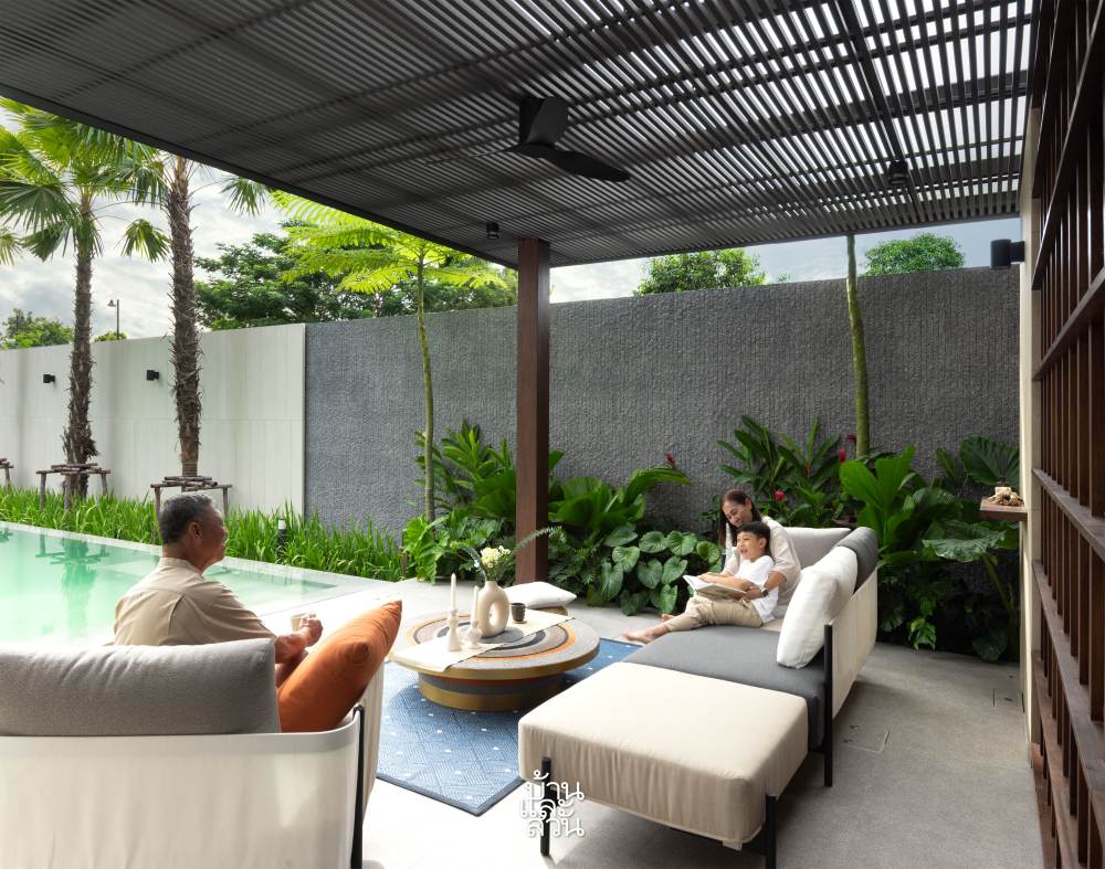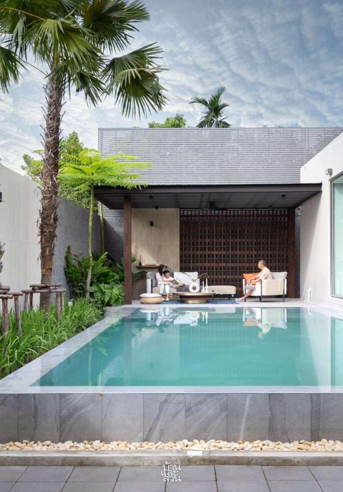 พื้นที่พักผ่อนหลังเลิกงานหรือวันหยุดสำหรับครอบครัวใหญ่ ในบรรยากาศ สวนโมเดิร์นสไตล์รีสอร์ต ที่ดูเชื่อมต่อกับสถาปัตยกรรมของตัวบ้านและโครงสร้างของสระว่ายน้ำ