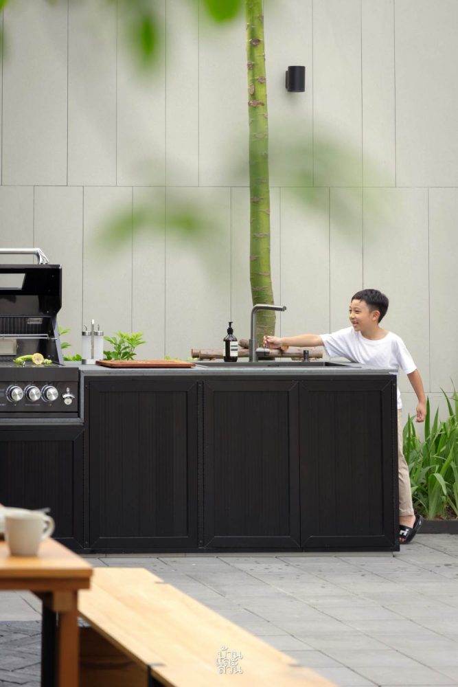 คุณแพน – จิรภิญญา เจียรวิชญ์ นักจัดสวนจากทีมงานสวนหลังบ้าน เริ่มเล่าถึงภาพรวมและรายละเอียดการออกแบบสวน “ต่อมาคือการจัดสรรพื้นที่ใช้งานในสวนที่ต้องออกแบบให้สอดคล้องกับตัวบ้านและสระว่ายน้ำ ซึ่งพื้นที่เปิดโล่งที่เหลือจะแบ่งออกเป็น 2 ส่วนหลักอย่างชัดเจน คือบริเวณหน้าบ้านและบริเวณท้ายสระน้ำ โดยพื้นที่หน้าบ้านแพนจะออกแบบให้รองรับการใช้งานได้อย่างยืดหยุ่นและเชื่อมโยงกับการใช้ชีวิตประจำวันของผู้อยู่อาศัยให้ลงตัว ซึ่งแพนจะให้แนวพรรณไม้อยู่บริเวณด้านข้าง แล้วเลือกใช้ไม้ใบที่โตช้า ไม่ต้องตัดแต่งบ่อยมาปลูกเป็นกลุ่ม เพื่อให้ดูแลรักษาง่าย ไม่เพิ่มภาระให้เจ้าของบ้าน และเลือกใช้พื้นฮาร์ดสเคปในการกำหนดขอบเขตการใช้งานเป็นหลัก โดยพื้นที่สวนส่วนกลางและทางเดินจะปูด้วยกระเบื้องโทนสีเทาอ่อนที่เรียบง่าย ในขณะที่โซนนั่งเล่นแยกพื้นผิวด้วยบล็อกปูพื้นลายก้างปลาโทนสีเทาเข้ม ช่วยเพิ่มมิติให้สวนดูน่าสนใจมากขึ้น นอกจากนี้ ยังเลือกใช้เฟอร์นิเจอร์ลอยตัว อย่างโต๊ะไม้ยาว ม้านั่ง เก้าอี้มีพนักพิง และเคาน์เตอร์เตาบาร์บีคิว พร้อมซิงก์ล้างมือ เพื่อคงความโปร่งโล่งและเปิดโอกาสให้สามารถปรับเปลี่ยนฟังก์ชันได้ ทั้งเป็นพื้นที่สังสรรค์ บาร์บีคิว หรือลานวิ่งเล่นของเด็ก ๆ