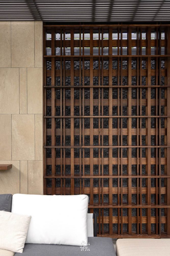 “อีกส่วนคือบริเวณท้ายของสระว่ายน้ำทางด้านหลังบ้าน เป็นมุมที่เชื่อมต่อการใช้งานกับพื้นที่ภายในบ้าน โดยอยู่ถัดจากห้องรับประทานอาหารและห้องเอนเทอร์เทนเมนต์ มีความเป็นส่วนตัวค่อนข้างสูง เพราะด้านหน้าจะถูกคั่นไว้ด้วยสระว่ายน้ำยาวตลอดแนว ซึ่งจากเดิมที่เคยเป็นลานโล่งเชื่อมต่อจากพื้นที่ขอบสระธรรมดา ทางทีมงานได้ออกแบบเปลี่ยนให้กลายเป็นมุมพักผ่อนกึ่งเอาต์ดอร์ ด้วยศาลาหลังคาโปร่งที่สามารถรับแสงธรรมชาติได้อย่างพอดี มีผนังด้านหลังที่กรุด้วยแผ่นกระเบื้องและระแนงไม้จริงฉลุแบบสั่งทำพิเศษเป็นลวดลายและรายละเอียดเล็ก ๆ ที่ช่วยเติมความละมุน ชวนให้รู้สึกอบอุ่นผ่อนคลาย ส่วนเฟอร์นิเจอร์ที่เลือกใช้จะเน้นโทนสีสบายตาเข้ากับบรรยากาศโดยรอบ เมื่อมาใช้งานบริเวณนี้ก็จะเปิดมุมมองเห็นพื้นที่ทั้งหมดผ่านผืนน้ำที่สะท้อนแสงแดดระยิบระยับ ช่วยให้รู้สึกสงบ เย็นสบาย และยังคงมีความเป็นส่วนตัว สามารถใช้งานได้ตลอดทั้งวัน ตั้งแต่จิบกาแฟยามเช้า อ่านหนังสือบ่าย ๆ ไปจนถึงนั่งคุยสบาย ๆ ยามเย็น”