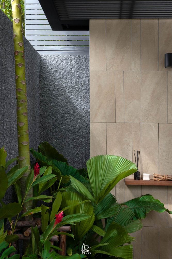 “เมื่อเข้ามาที่หน้างานจะเห็นว่าบ้านหลังนี้เป็นหลังริมสุดของโครงการ ทำให้มีพื้นที่ว่างภายนอกมากกว่าบ้านหลังอื่น ๆ แต่ในขณะเดียวกันก็ต้องแลกมาด้วยความเป็นส่วนตัวบางส่วน เนื่องจากหน้าบ้านจะอยู่ใกล้กับบริเวณทางขึ้นของสะพานและด้านข้างยังติดกับคลองนอกโครงการ ทำให้รั้วรอบบ้านจึงต้องมีความสูงที่ค่อนข้างมาก ซึ่งเมื่อมองจากในบ้านเห็นผนังเปล่าขนาดใหญ่ ก็อาจทำให้รู้สึกทึบและอึดอัดได้ ทางทีมจึงออกแบบผนังโดยต่อเติมรายละเอียดเน้นงานปิดผิวใหม่ให้มีลูกเล่นที่น่าสนใจมากยิ่งขึ้น ด้วยแนวไม้พุ่ม แผ่นหินจริง และแผ่นกระเบื้องหินแกรนิต เพิ่มความโมเดิร์นและกลมกลืนกับองค์ประกอบธรรมชาติอื่น ๆ ส่วนพรรณไม้จะเน้นชนิดที่ทรงสูงชะลูดมีพุ่มที่ปลายยอด อย่าง ปาล์ม และทาวเวอร์ทรี ปลูกเรียงเป็นแถว สร้างเส้นนำสายตาในแนวตั้ง เพื่อลดทอนความสูงของรั้ว แต่ไม่บดบังแพตเทิร์นบนกำแพงมากจนเกินไป”