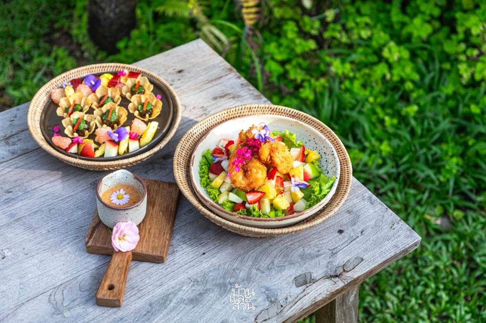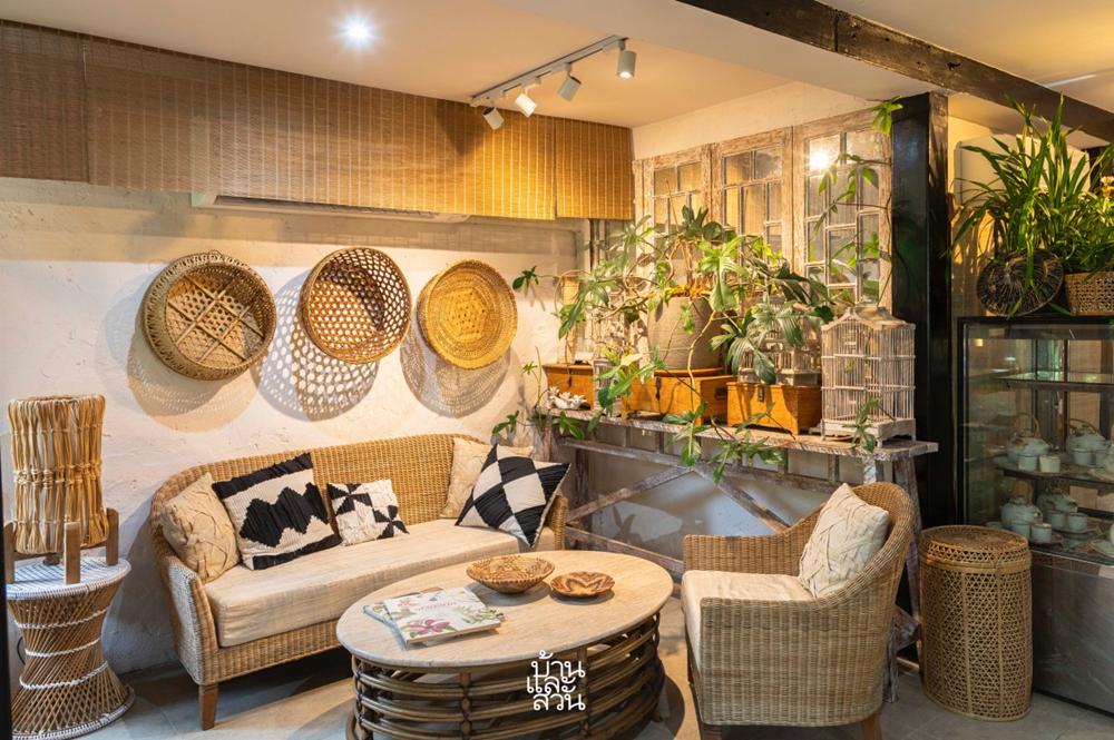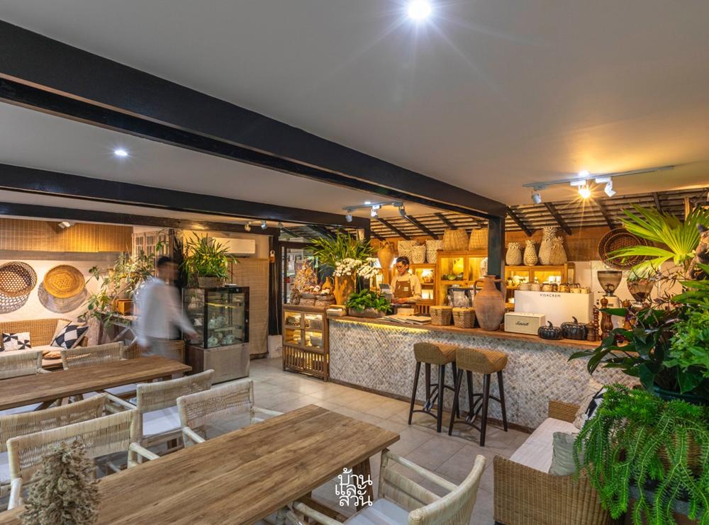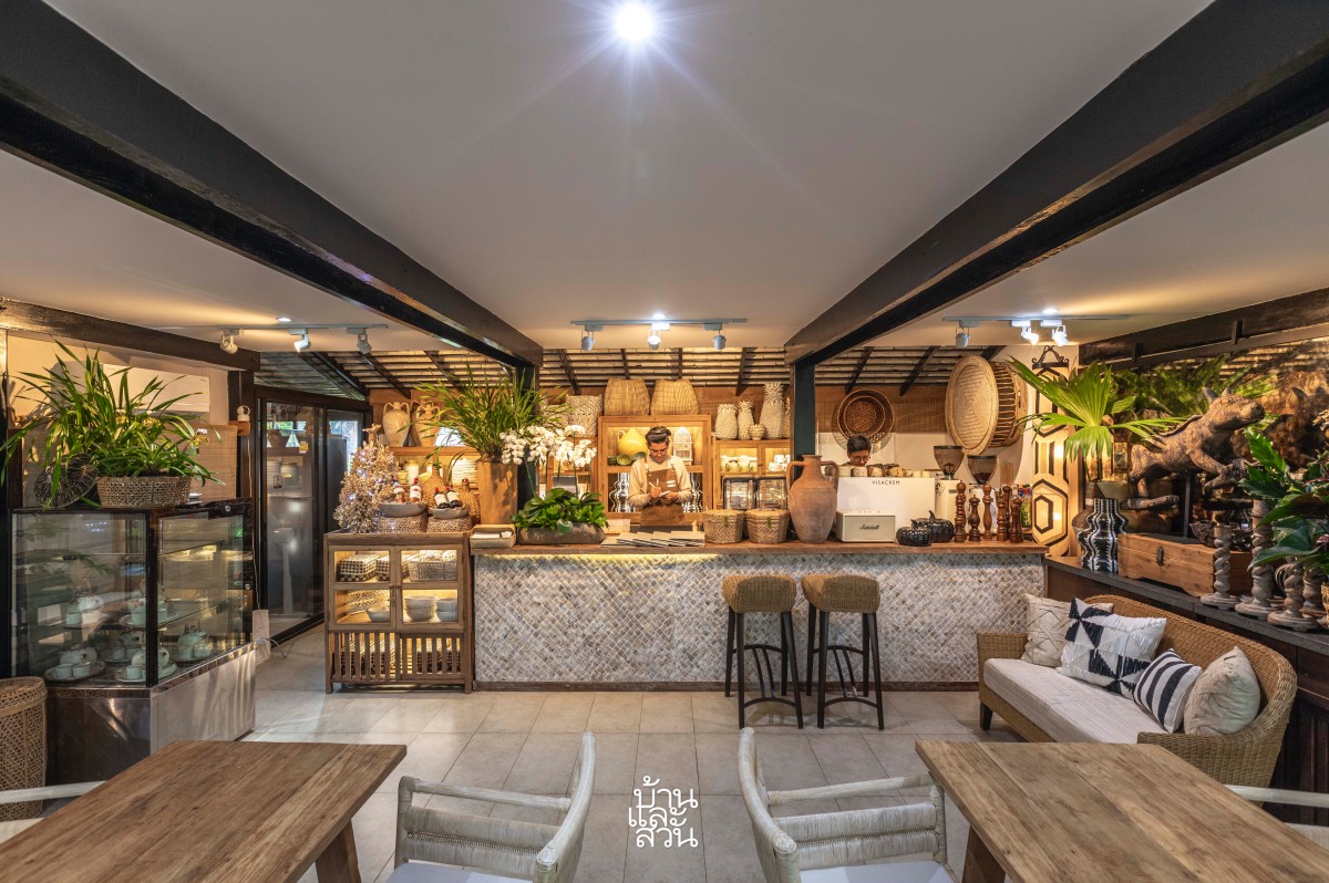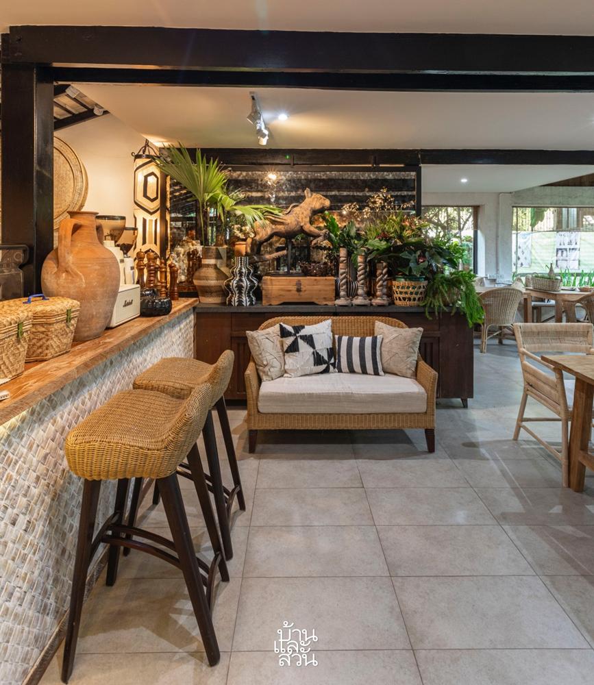 โต๊ะไม้จากลำพูนมีเอกลักษณ์ที่ความเนี้ยบและความเรียบ ผิวไม้ถูกไสจนเนียนเรียบ บ่งบอกถึงความประณีตและการควบคุมของช่าง ส่วนงานจากบ้านถวายเลือกที่จะโชว์ความงามของเสี้ยนไม้ เส้นใยไม้ที่ไม่เรียบเป็นระเบียบ แต่กลับให้ความรู้สึกเป็นธรรมชาติและจับต้องได้ ขณะที่ช่างจากแม่ริมเลือกปล่อยให้รอยครูดจากเลื่อยยังคงอยู่บนผิวไม้ นิยามของความงามจึงไม่ตายตัว แต่แสดงออกผ่านบริบทและภูมิหลังของแต่ละท้องถิ่น ของตกแต่งอื่น ๆ เช่น หมอนอิงจากผ้าทอกะเหรี่ยงที่ทอด้วยกี่เอว งานจักสาน หวาย ไม้เก่า หรือของจากบาหลี ล้วนถูกร้อยเรียงเข้ากันอย่างลงตัว ทำให้ภาพรวมของร้านเต็มไปด้วยรายละเอียดที่มีชีวิตและเรื่องเล่า นอกจากความงามแล้ว ด้านการออกแบบผังร้านยังแยกโซนแห้งและเปียกอย่างมีประสิทธิภาพ พร้อมระบบโครงสร้างที่คิดเผื่อการดูแลในระยะยาว