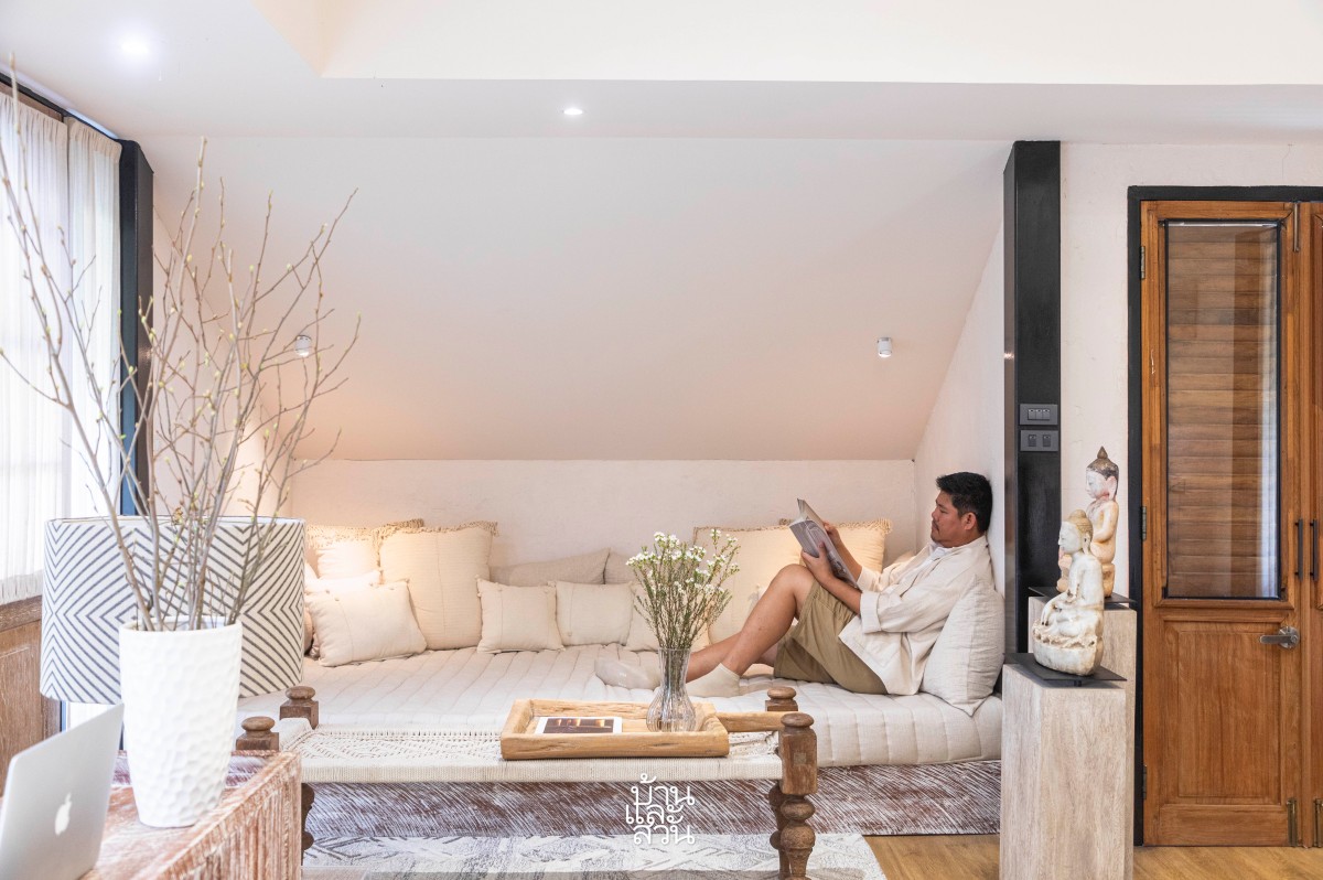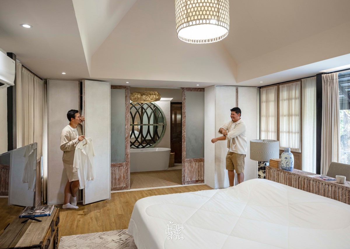 ห้องนอนสไตล์รีสอร์ตที่อยู่ชั้นบนคือพื้นที่ความสุขในชีวิตประจำวันของคุณเติม เป็นหนึ่งตัวอย่างของการใช้ชีวิตอย่างมีรสนิยม ผสมผสานความรู้เรื่องโรงแรมเข้ากับความชอบส่วนตัว ออกแบบพื้นให้มีโทนสีอบอุ่น พื้นผิวผนังเลือกทำเป็นเท็กซ์เจอร์แบบฉาบปูนโบราณ ให้แสงเล่นกับผนัง เกิดมิติความงามแบบไม่ต้องประดิษฐ์ เฟอร์นิเจอร์บางชิ้นเป็นไม้เก่าจากบ้านโคโลเนียลภาคเหนือ บานประตูไม้สักเก่า กระจกครึ่งวงกลมจากหน้าต่างบ้านเก่าที่ให้ความรู้สึกกึ่งย้อนยุคกึ่งร่วมสมัย แม้แต่สุขภัณฑ์อย่างชักโครกก็เลือกให้เหมาะกับสรีระ เนื่องจากเจ้าของบ้านมีปัญหาสุขภาพด้านกระดูก จึงต้องใส่ใจทุกรายละเอียด เป็นพื้นที่พักผ่อนที่สะท้อนอัตลักษณ์ได้อย่างตรงใจ