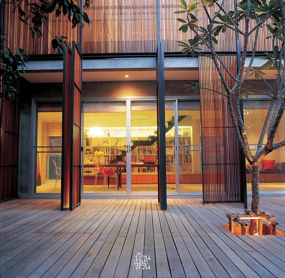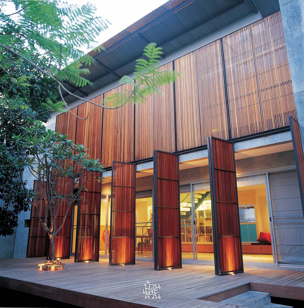 บ้านกล่อง โปร่งโล่ง โปร่งแสง ของ 2 มัณฑนากร ที่เด่นด้วยแผงไม้ซี่โปร่งๆ ซึ่งทั้งคู่ตั้งใจออกแบบแผงไม้นี้ขึ้นเพื่อกั้นแสงแดดให้ตัวบ้านในช่วงเช้า ส่วนตอนกลางคืนก็ต้องการให้แสงลอดผ่านซี่ไม้ออกมา จนดูเหมือนโคมไฟสี่เหลี่ยมขนาดใหญ่ เพราะให้ความสำคัญกับแปลนที่สัมพันธ์กับแสงภายในและภายนอก