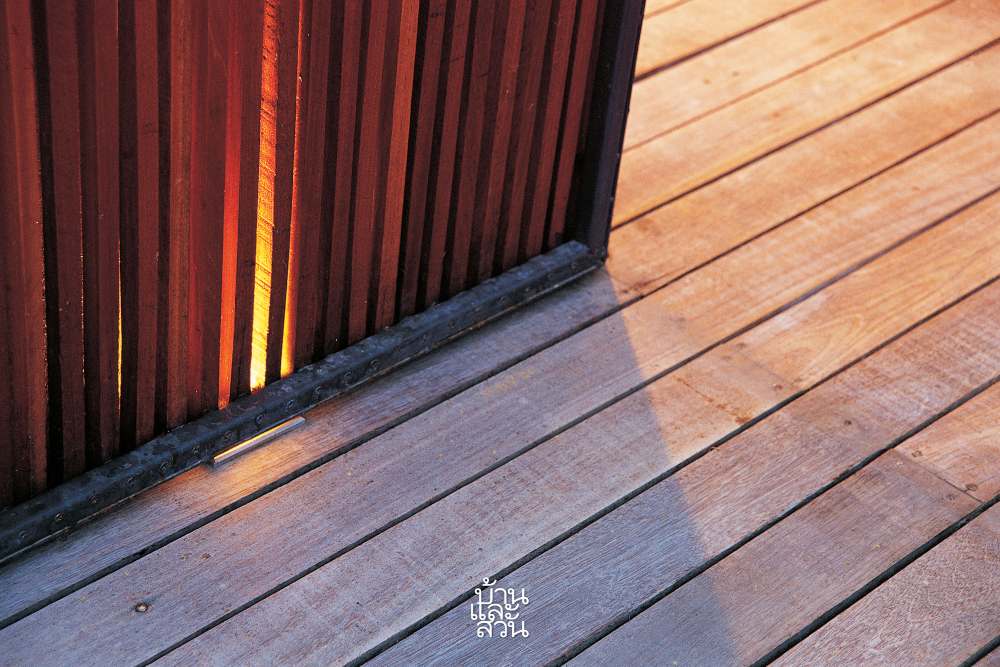 “เราทำแผงไม้นี้ขึ้นเพื่อกั้นแสงแดดให้ตัวบ้านในช่วงเช้า ส่วนตอนกลางคืนก็ต้องการให้แสงลอดผ่านซี่ไม้ออกมา จนดูเหมือนโคมไฟสี่เหลี่ยมขนาดใหญ่”
