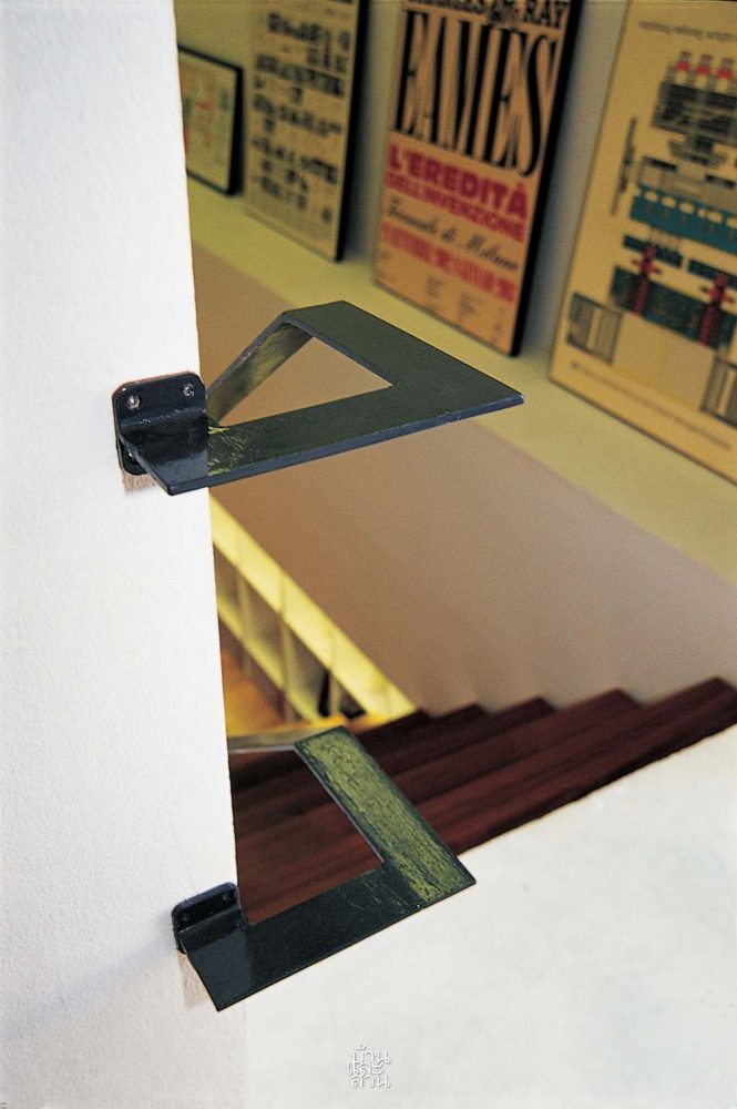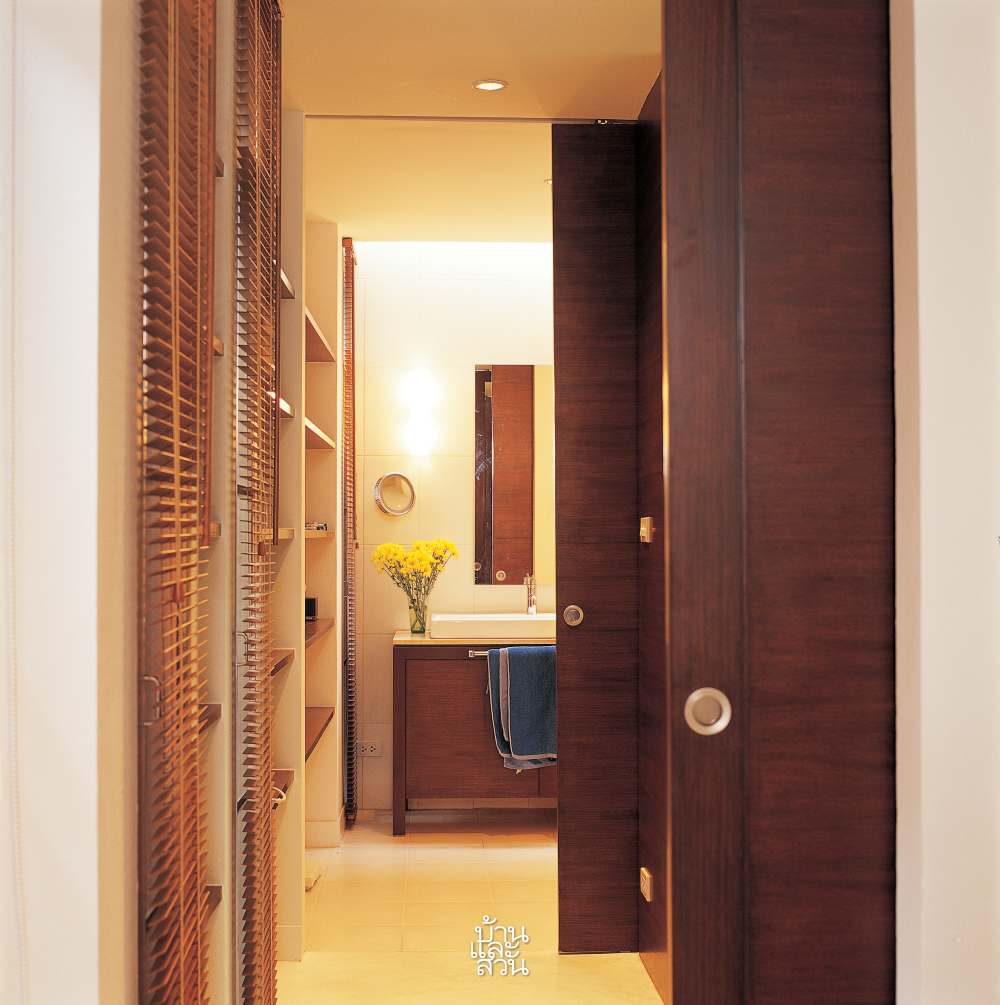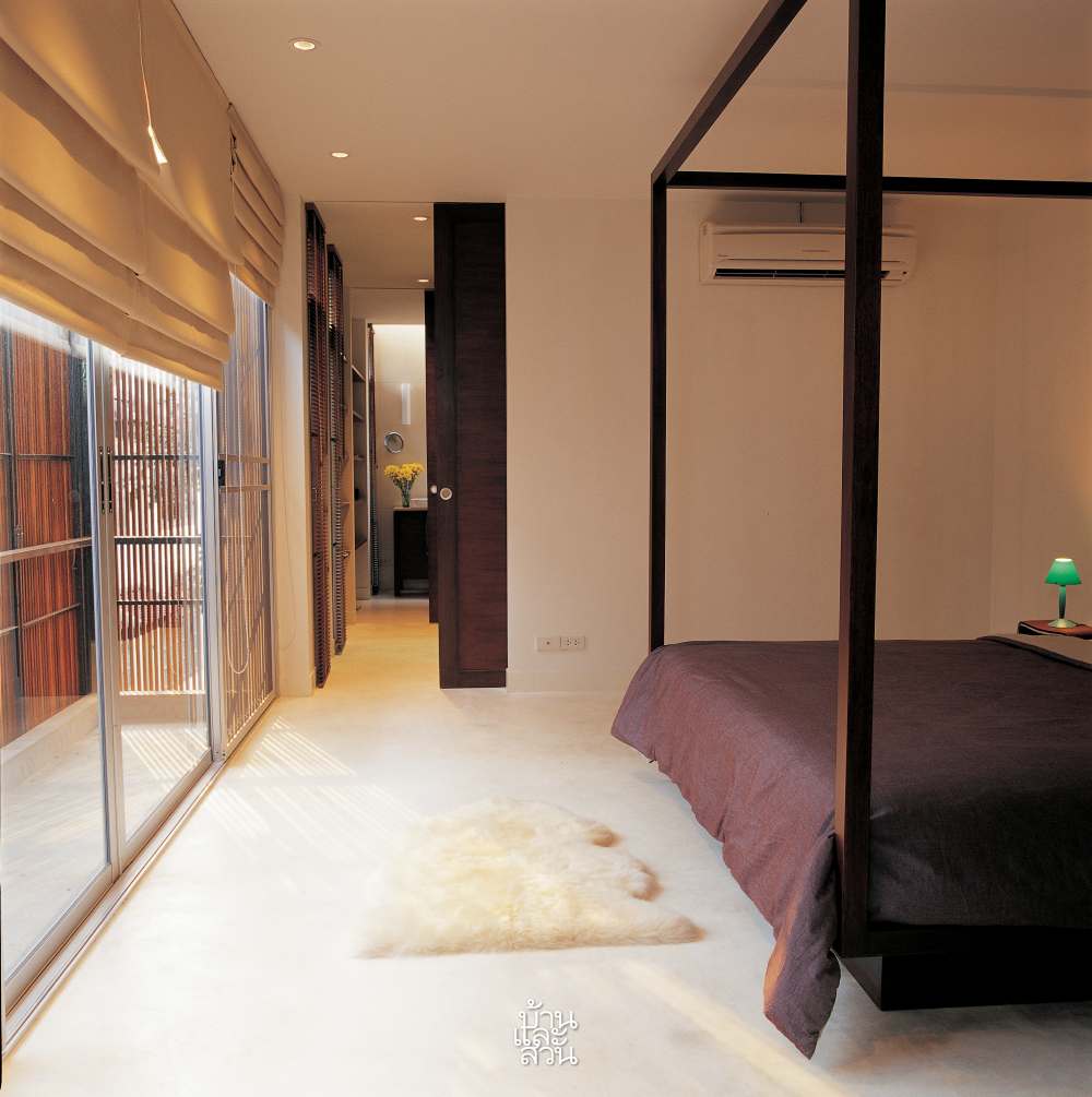 สำหรับชั้นบนนั้นเชื่อมต่อด้วยบันไดทรงโปร่งที่ออกแบบให้ยาวพิเศษ เพื่อให้รับกับความยาวของพื้นที่ห้อง และด้วยพื้นที่แคบยาวของห้องนอนชั้น 2 จึงรวมห้องน้ำ ห้องแต่งตัวไว้ในส่วนเดียวกัน แล้วกั้นส่วนด้วยประตูบานเลื่อน เพื่อประหยัดพื้นที่และช่วยให้ห้องดูโปร่งโล่ง