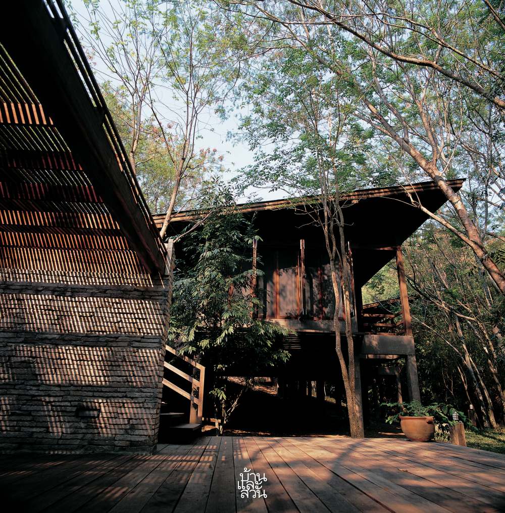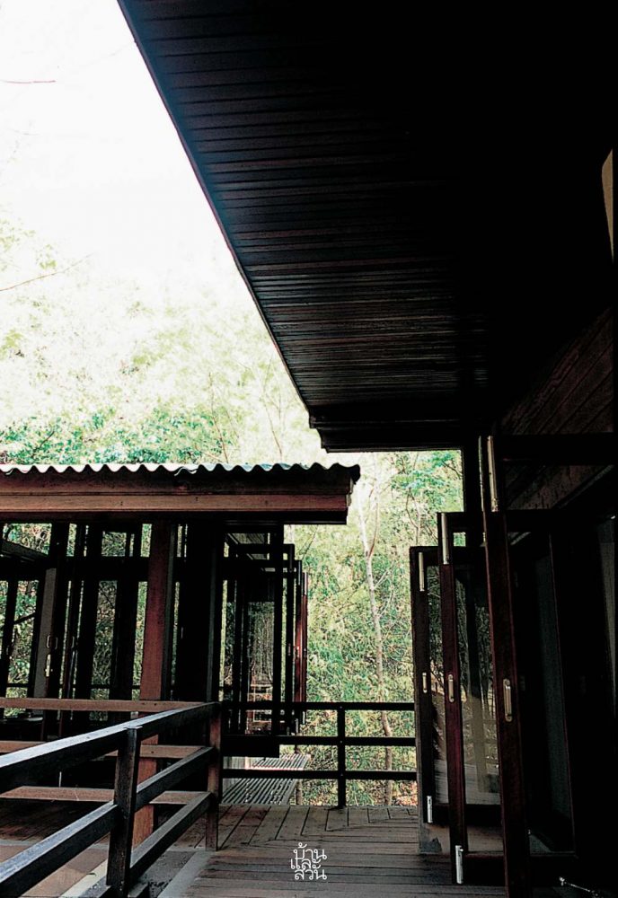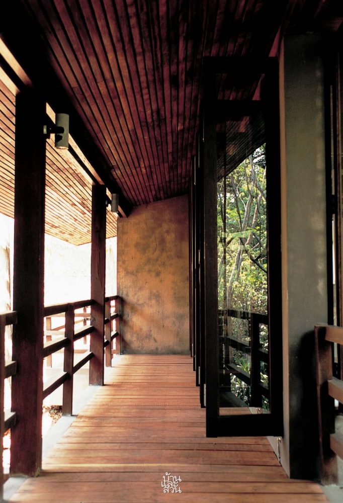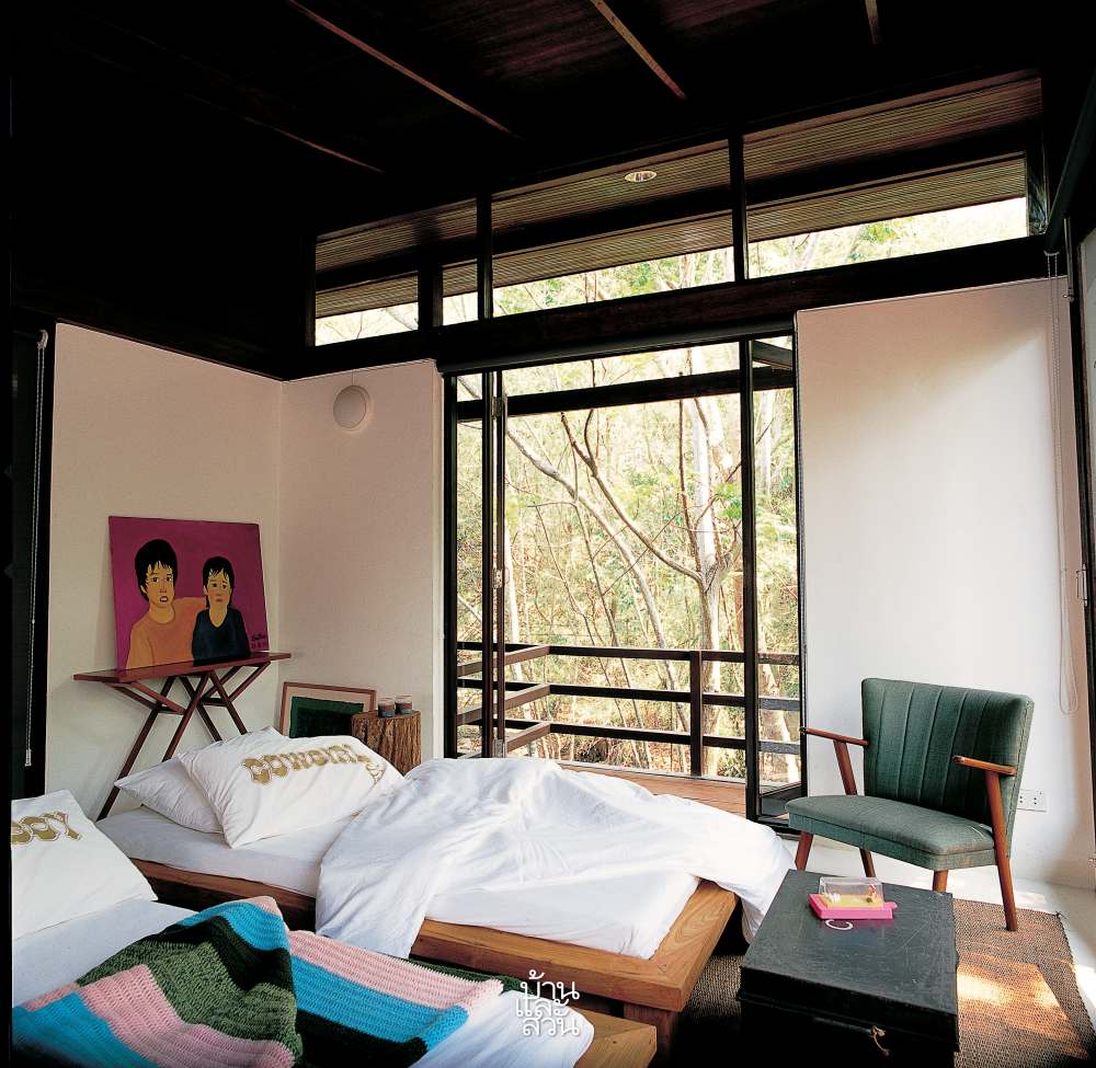“ก่อนหน้านี้เราตระเวนหาที่ดินกว่า 30 แห่งทั่วประเทศ จนในที่สุดก็ตัดสินใจเลือกพื้นที่กลางหุบเขาแห่งนี้ เพราะชอบที่มีน้ำตกเล็กๆไหลผ่านกลางที่ดิน ซึ่งเป็นเขาเตี้ยๆที่ยังคงสภาพป่าที่สมบูรณ์อยู่ ช่วงแรกก็สร้างบ้านหลังเล็กๆ เพียงสองหลังไว้เป็นที่พักเท่านั้น แต่ในเวลาต่อมาได้ตัดสินใจต่อเติมเป็นหกหลัง เพื่อให้มีห้องพักเพียงพอสำหรับเพื่อนที่ชอบมาเที่ยวด้วยกันเสมอ รวมทั้งสร้างสตูดิโอสำหรับทำงานศิลปะในยามว่างอีกด้วย” บ้านไม้สไตล์ดิบๆ