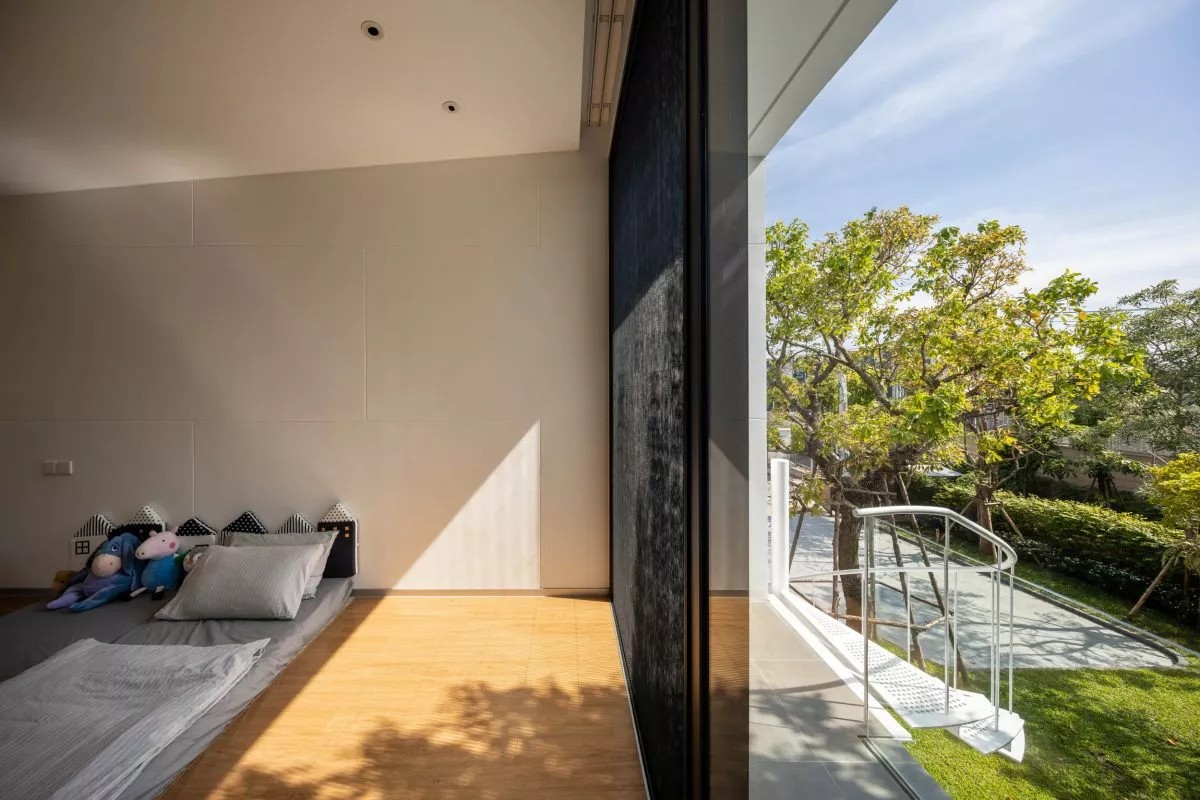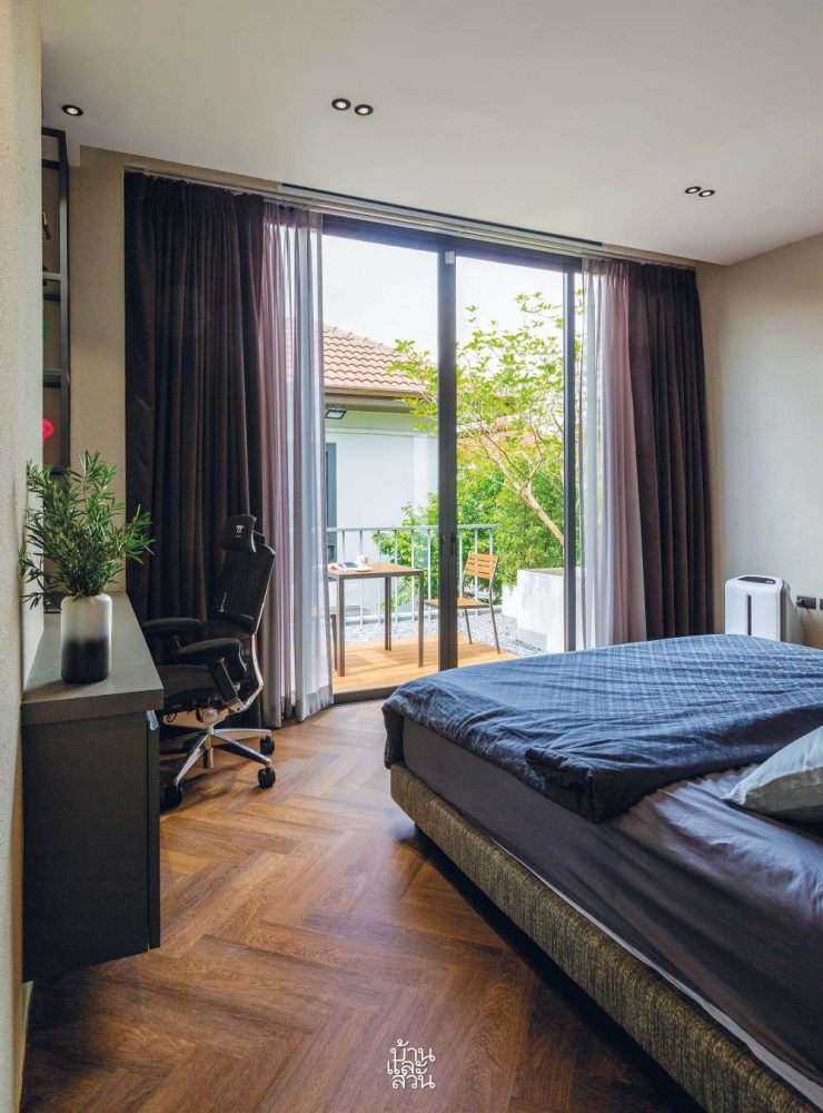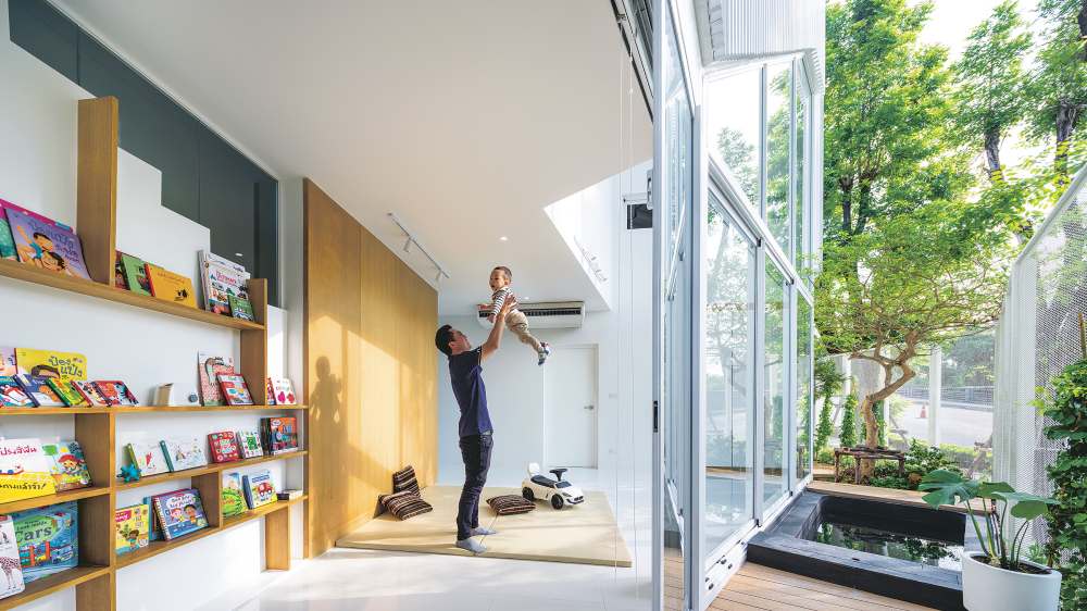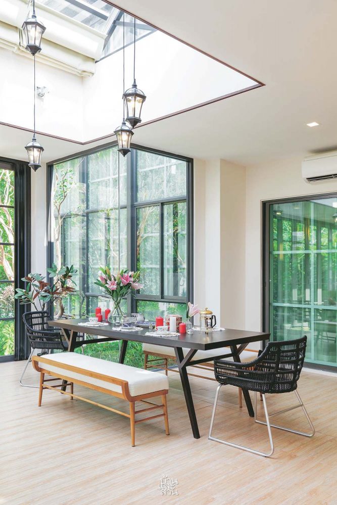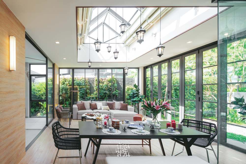 บ้านจัดสรรที่ได้รับการออกแบบตกแต่งสไตล์ลักชัวรี่ มีมุมไฮไลต์ของบ้านคือศาลาอเนกประสงค์ที่มีลักษณะเหมือน กลาสเฮ้าส์ ซึ่งถือเป็นส่วนต่อเติมที่เพิ่มขึ้นมาใหม่จากเเปลนเดิมของบ้านจัดสรรที่ให้มา โดยสถาปนิกได้เลือกพื้นที่สวนด้านข้างของตัวบ้าน เพื่อทำเป็นส่วนต่อขยายโครงสร้างเชื่อมติดกับมุมนั่งเล่นภายในบ้าน เเต่เเยกฐานรากออกจากกัน ด้านบนเปิดเป็นหลังคากระจกลามิเนตขนาดใหญ่ช่วยให้แสงส่องสว่างไปทั่วทั้งบริเวณดูโปร่งตา ส่วนด้านหน้าออกแบบช่องเปิดเป็นประตูบานเฟี้ยมกระจกขนาดใหญ่ที่เปิดออกได้จนสุดสำหรับเปิดรับวิวสวนเเละลมเย็นสบายตลอดวัน เเละหากเปิดประตูนี้ออกทั้งหมดจะคล้ายกับศาลาที่ใช้งานได้อย่างเต็มที่ เดินเข้าได้ทั้งจากภายในบ้านและลงไปยังสวนได้โดยตรง ในส่วนนี้ด้านหลังยังมีมุมสำหรับใช้เป็นห้องเด็กโดยเฉพาะ เพื่อให้พ่อแม่สามารถดูลูกเล็ก ๆ ได้ขณะพักผ่อนอยู่ที่โซนนั่งเล่นของกลาสเฮ้าส์ >> อ่านต่อ