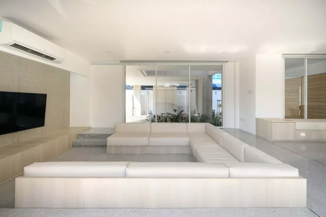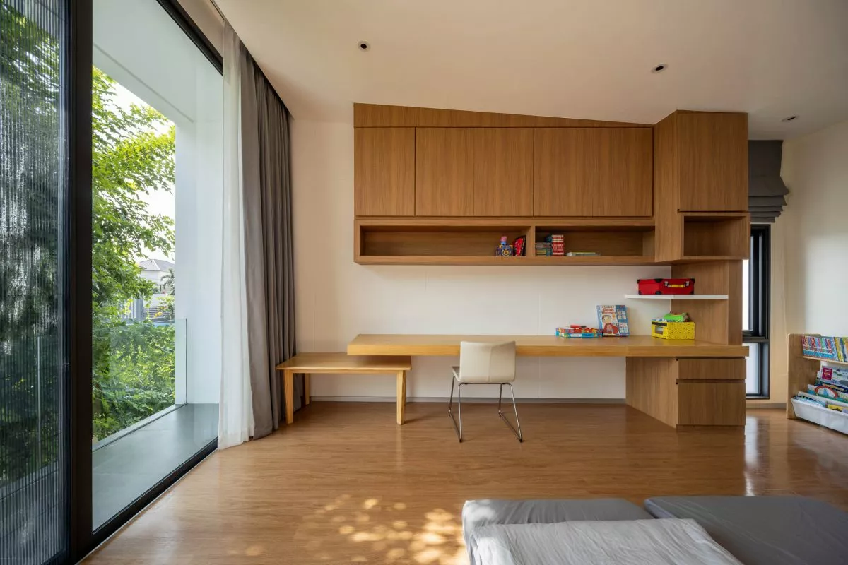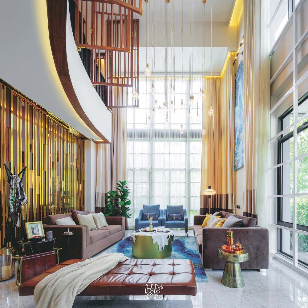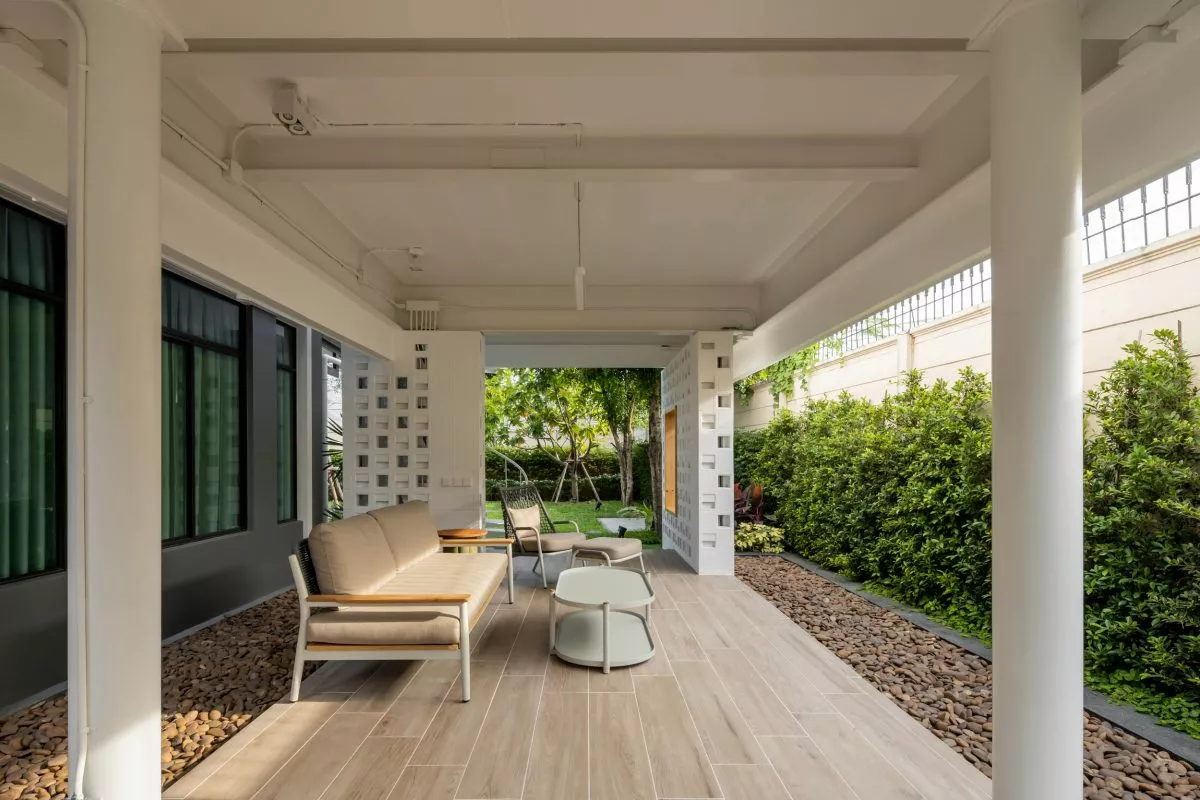บ้านจัดสรรที่ได้รับการออกแบบตกแต่งสไตล์ลักชัวรี่ มีมุมไฮไลต์ของบ้านคือศาลาอเนกประสงค์ที่มีลักษณะเหมือน กลาสเฮ้าส์ ซึ่งถือเป็นส่วนต่อเติมที่เพิ่มขึ้นมาใหม่จากเเปลนเดิมของบ้านจัดสรรที่ให้มา โดยสถาปนิกได้เลือกพื้นที่สวนด้านข้างของตัวบ้าน เพื่อทำเป็นส่วนต่อขยายโครงสร้างเชื่อมติดกับมุมนั่งเล่นภายในบ้าน เเต่เเยกฐานรากออกจากกัน ด้านบนเปิดเป็นหลังคากระจกลามิเนตขนาดใหญ่ช่วยให้แสงส่องสว่างไปทั่วทั้งบริเวณดูโปร่งตา ส่วนด้านหน้าออกแบบช่องเปิดเป็นประตูบานเฟี้ยมกระจกขนาดใหญ่ที่เปิดออกได้จนสุดสำหรับเปิดรับวิวสวนเเละลมเย็นสบายตลอดวัน เเละหากเปิดประตูนี้ออกทั้งหมดจะคล้ายกับศาลาที่ใช้งานได้อย่างเต็มที่ เดินเข้าได้ทั้งจากภายในบ้านและลงไปยังสวนได้โดยตรง ในส่วนนี้ด้านหลังยังมีมุมสำหรับใช้เป็นห้องเด็กโดยเฉพาะ เพื่อให้พ่อแม่สามารถดูลูกเล็ก ๆ ได้ขณะพักผ่อนอยู่ที่โซนนั่งเล่นของกลาสเฮ้าส์ >> อ่านต่อ
