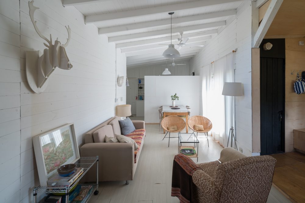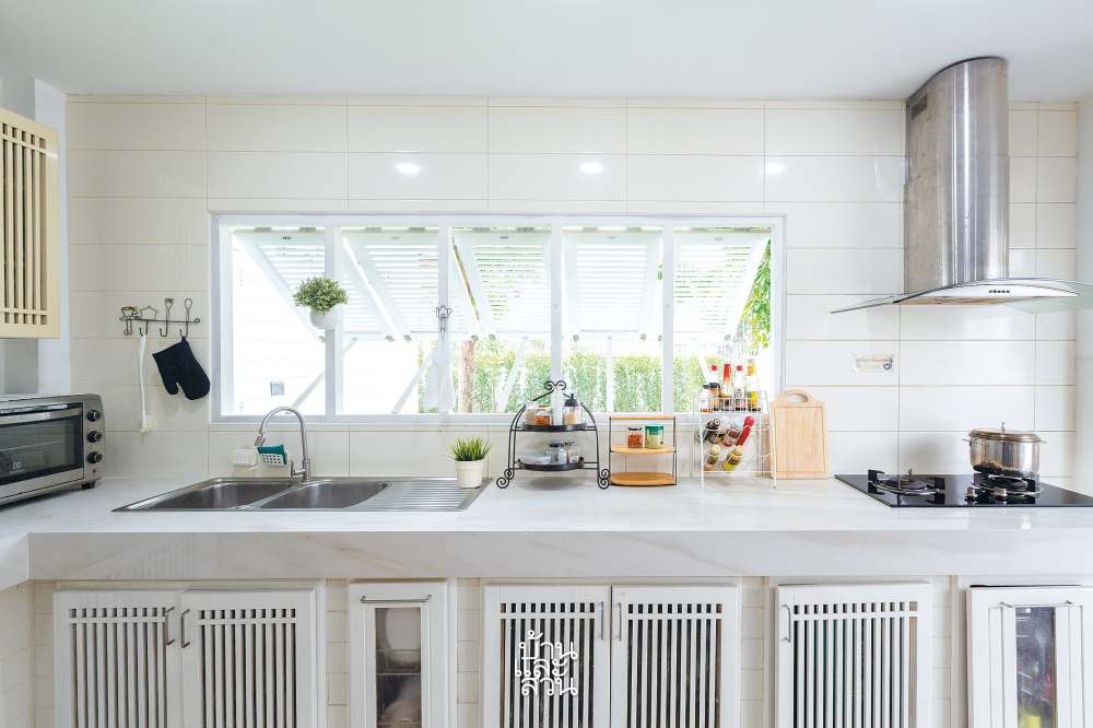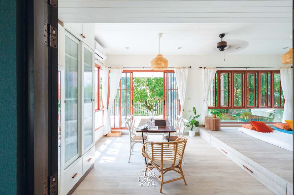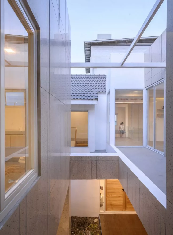 เจ้าของบ้านซื้อบ้านสองหลังที่ติดกันนี้ภายในโครงการหมู่บ้านจัดสรรเพื่อเตรียมตัวล่วงหน้าสำหรับการขยายครอบครัวของลูกทั้งสองคนในอนาคต โดยทุบกำแพงที่กั้นระหว่างกันออกและปรับปรุงพื้นที่ว่างตรงกลางเพื่อให้บ้านทั้งสองหลังดูกลมกลืนกันเป็นหนึ่งเดียวด้วยสวนสีเขียว ระเบียงไม้ และลานอเนกประสงค์ การเชื่อมต่อพื้นที่รอบบ้านให้เป็นบริเวณเดียวกันนี้เป็นเพียงจุดเริ่มต้นของการปรับปรุงบ้านส่วนอื่นๆ ในเวลาต่อมา อย่างแรกคือการต่อเติมห้องครัวตรงหลังบ้านหลังหลักที่เจ้าของบ้านอยู่อาศัย โดยที่ลูกทั้งสองคนที่อาศัยอยู่ในบ้านอีกหลังหนึ่งสามารถมาใช้งานห้องครัวนี้ได้เช่นกัน พร้อมเข้า-ออกได้สะดวกผ่านทางประตูหลังบ้าน โจทย์ที่เจ้าของบ้านให้สถาปนิกคือบ้านในบรรยากาศผ่อนคลายด้วยโทนสีขาวที่ดูโปร่งโล่ง สบายตา สถาปนิกจึงปรับใช้วัสดุง่ายๆ ให้ดูน่าสนใจ โดยการใช้ชิ้นไม้เทียมทาสีขาวติดบนผนังภายนอกตามแนวตั้งเป็นจังหวะ รวมถึงผนังไม้สีขาวตีแนวนอนซ้อนเกล็ดทับผนังก่ออิฐฉาบปูน เพื่อสร้างรูปลักษณ์ที่ดูคล้ายกับบ้านสไตล์บาร์นเฮ้าส์แบบฝรั่งที่ดูอบอุ่นเป็นกันเอง แต่ยังคงดูกลมกลืนไปกับดีไซน์ของบ้านส่วนเดิมด้านหน้าด้วย >> อ่านต่อ