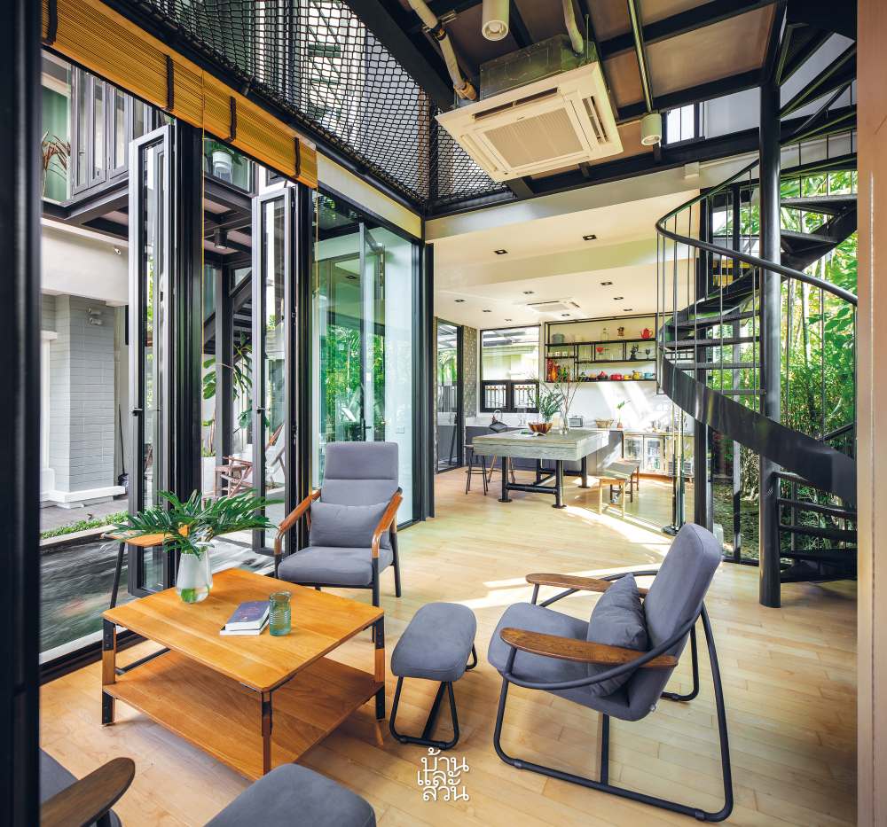 บ้านต่อเติมดีไซน์สวย เป็นบ้านโครงสร้างเหล็กที่ต่อเติมบนพื้นที่ข้างบ้านเก่า โดยออกแบบเป็นบ้านสไตล์ลอฟต์ที่ใช้เป็นพื้นที่สำหรับการสังสรรค์ ช่วยเชื่อมความสัมพันธ์ระหว่างพ่อแม่กับลูกวัยรุ่นให้แน่นแฟ้นยิ่งขึ้นกว่าเก่า อีกทั้งบรรยากาศที่แวดล้อมด้วยธรรมชาติ มีทั้งต้นไม้ บ่อปลาคาร์ป สายน้ำ และสายลม ทำให้การอยู่บ้านนานๆในช่วง WFH ไม่น่าเบื่อเลยสักนิด >> อ่านต่อ