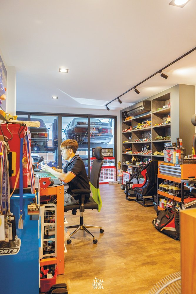 เมื่อมองจากด้านหน้า เราอาจไม่รู้เลยว่าบ้านสองชั้นหน้าตาเรียบเท่ที่เห็นนี้ไม่ใช่บ้านสร้างใหม่ทั้งหลัง แต่เป็นบ้านต่อเติมใหม่ของคนรักรถ ซึ่งต่อขยายออกมาจากบ้านหลังเดิมที่ตั้งอยู่ลึกเข้าไปด้านใน โดยส่วนต่อเติมด้านหน้านี้เปรียบเสมือนกับบ้านหลังใหม่สำหรับตัวเจ้าของบ้านโดยเฉพาะ ซึ่งขยายออกมาจากบ้านหลังเดิมที่เป็นพื้นที่ของสมาชิกคนอื่นๆ ในครอบครัว โดยยังคงฟังก์ชันของการอยู่ร่วมกันในบ้านหลังเดียว แต่เพิ่มเติมความเป็นส่วนตัว และปรับปรุงสเปซให้ตอบโจทย์ไลฟ์สไตล์คนรักรถตัวยง ด้วยการจัดสรรพื้นที่จอดรถให้เพียงพอสำหรับทั้งรถยนต์ที่ใช้เป็นประจำและรถยนต์สะสมของครอบครัวรวม 8 คัน รวมถึงเปลี่ยนห้องเก่าชั้นล่างของบ้านหลังเดิมให้กลายเป็นพื้นที่เวิร์คช็อปเกี่ยวกับรถด้วย >> อ่านต่อ