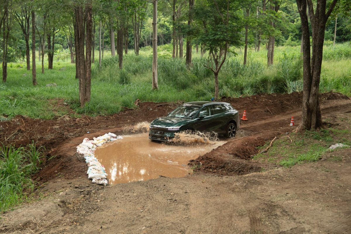 - ฐานที่ห้า คือ Water Wading Capability ทดสอบการวิ่งผ่านพื้นที่น้ำขังสูง เพื่อทดสอบการป้องกันน้ำและฝุ่นเข้าสู่แบตเตอรี่ใต้ท้องรถ โดย ZEEKR 7X ได้รับมาตรฐานการป้องกันน้ำและฝุ่น IP67