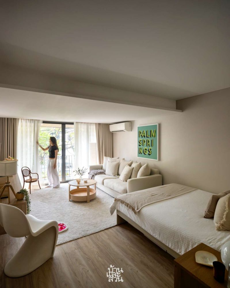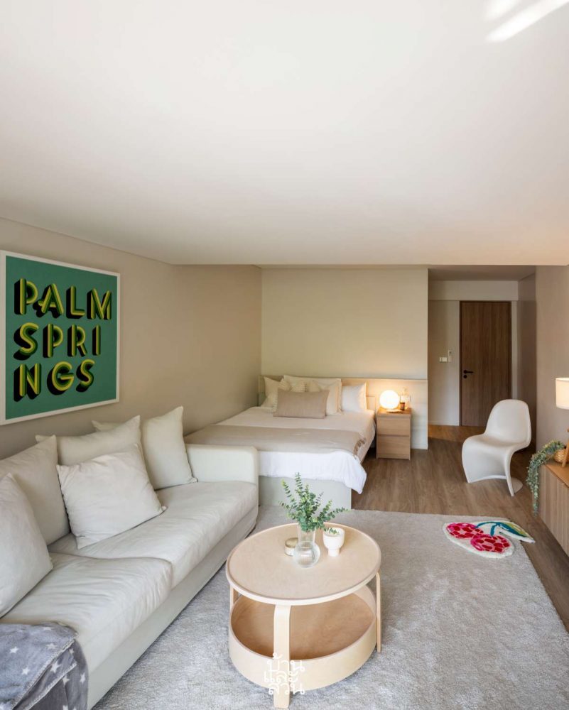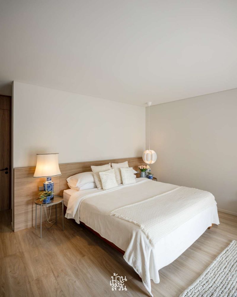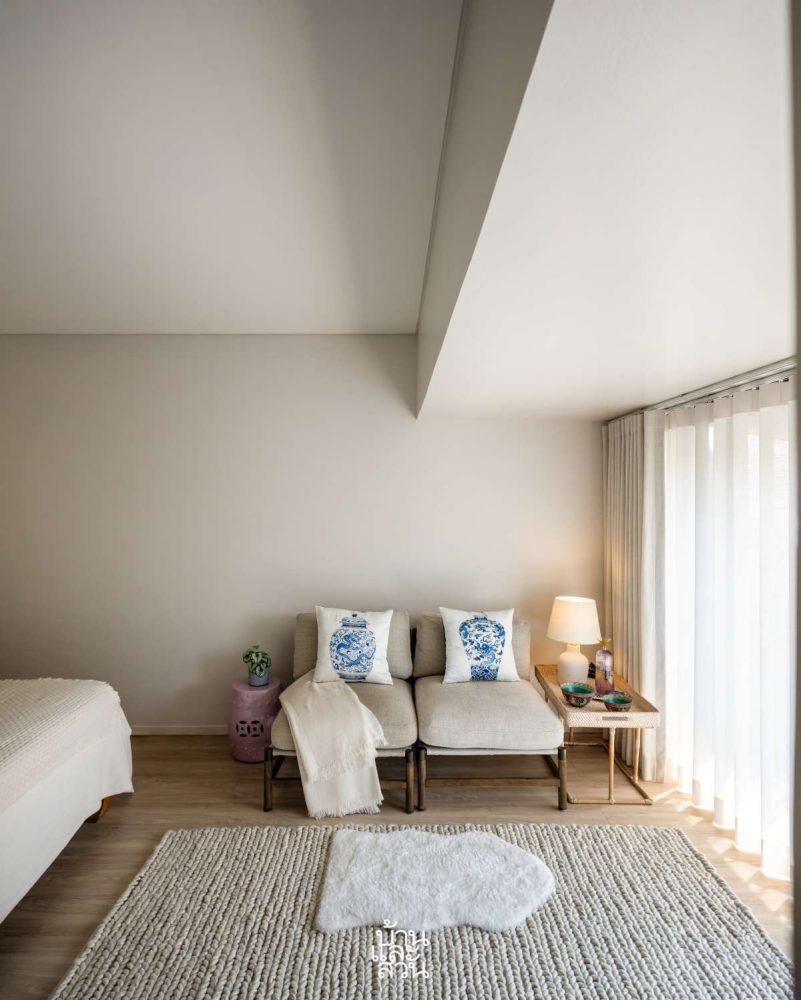 ห้องนอนลูกสาวออกแบบให้ได้ประสบการณ์เหมือนมานอนในโรงแรม โดยเข้ามาจะพบกับเตียงนอนและ พื้นที่นั่งเล่นอยู่ริมระเบียง ส่วนพื้นที่เก็บของจะอยู่รวมกับโซนแต่งตัวทั้งหมด ภายในห้องตกแต่งอย่าง เรียบง่าย สอดคล้องกับบุคลิกมินิมัลของเจ้าของห้อง เลือกใช้โทนสีอ่อนสบายตา และพื้นไม้ SPC ที่สามารถเปลี่ยนได้ง่ายในอนาคต