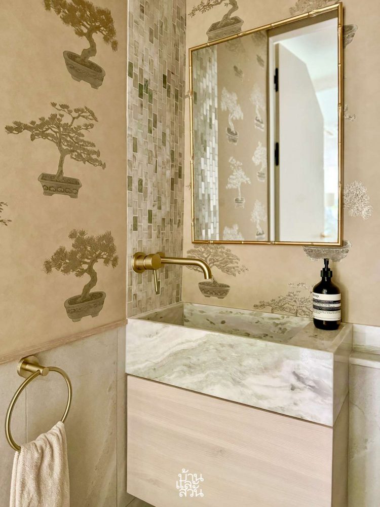 ห้องน้ำใต้บันไดตกแต่งอย่างสวยงามและมีลูกเล่นมากกว่าห้องน้ำอื่น ๆ ด้วยวอลล์เปเปอร์ลวดลายโดดเด่น ผสานกับสุขภัณฑ์ที่เลือกใช้เฉดสีใกล้เคียงกัน ช่วยเติมความสดใสให้พื้นที่ขนาดเล็กนี้ดูมีชีวิตชีวา