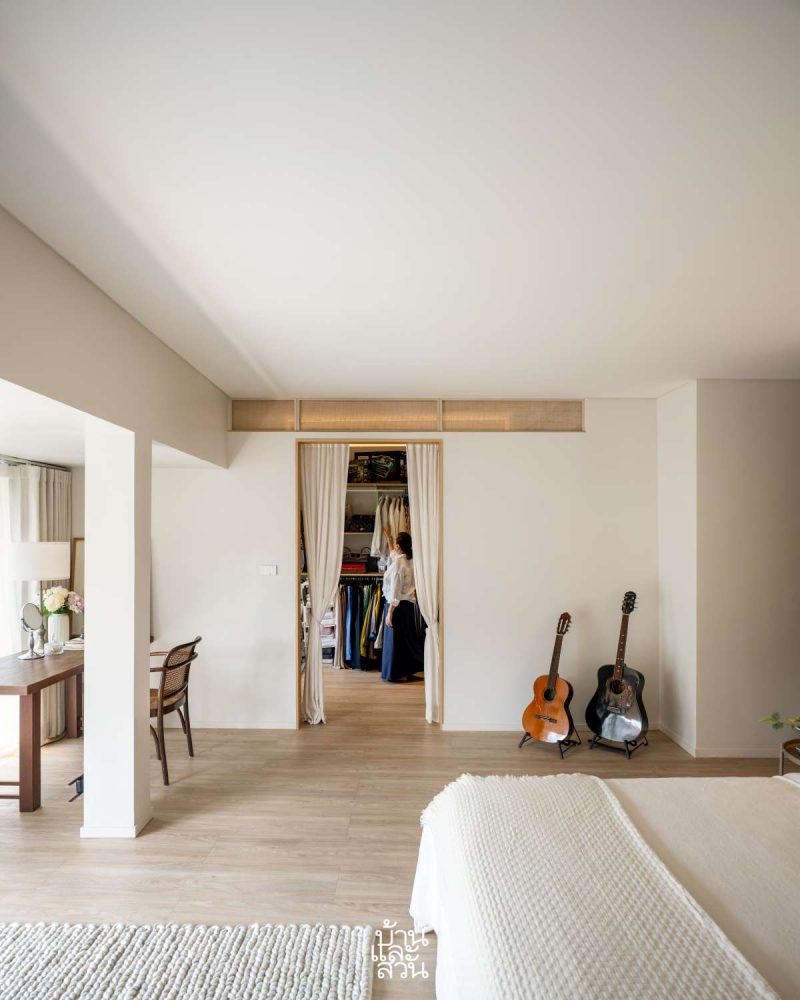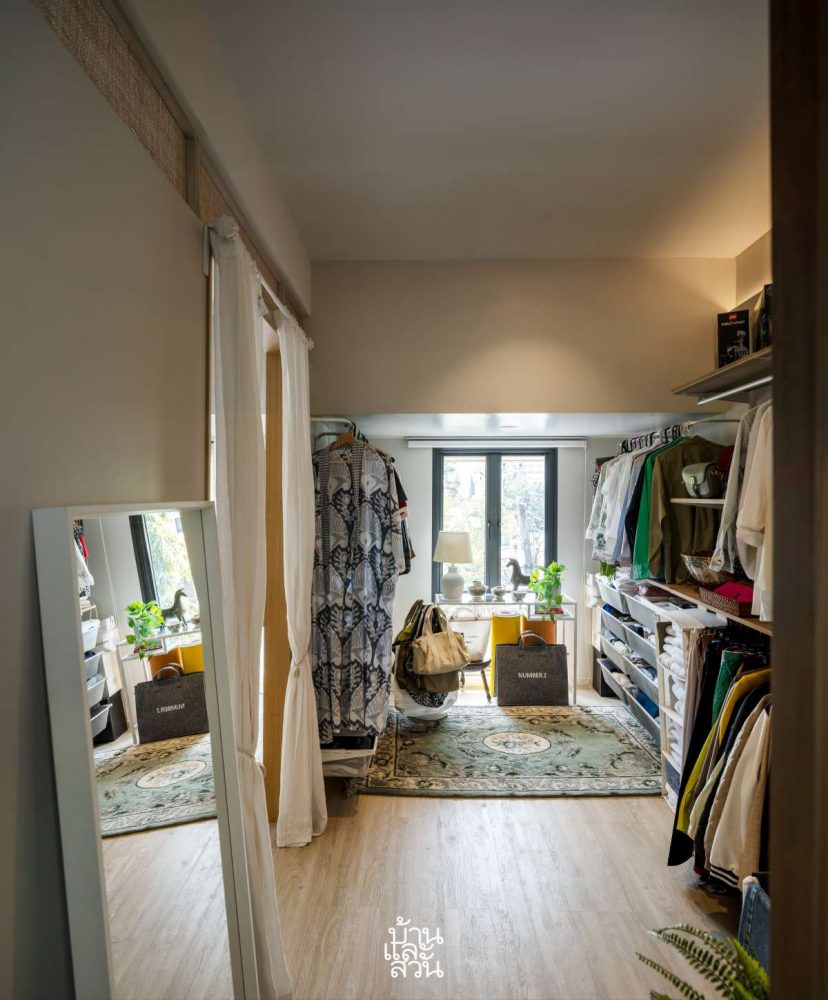 โซนห้องแต่งตัวของห้องนอนใหญ่ออกแบบเป็นชั้นแขวนลอยแทนตู้ปิดทึบ เพื่อให้สามารถหยิบจับหาของได้ง่าย