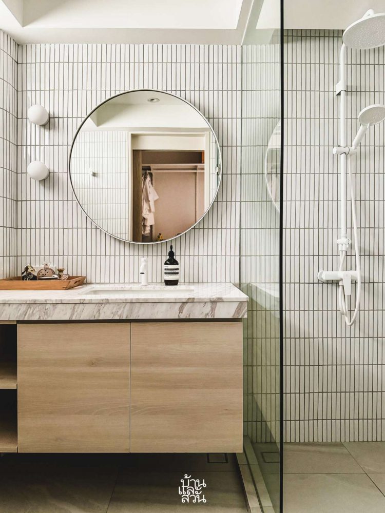 ห้องน้ำของลูกๆ ออกแบบอย่างเรียบง่ายแต่ใส่ใจรายละเอียด เลือกใช้ท็อปหินลายหินอ่อนคู่กับตู้ล่างไม้ลามิเนตสีอ่อน เติมความอบอุ่นให้พื้นที่ พร้อมดวงโคมดีไซน์ทันสมัยที่เข้ากันกับกระเบื้องแนวตั้ง สร้างบรรยากาศโปร่ง โล่ง และใช้งานได้จริง