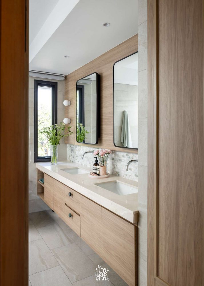 ห้องน้ำใหญ่ออกแบบให้มีบรรยากาศอบอุ่นเป็นพิเศษ ด้วยการเลือกใช้โทนสีไม้เป็นหลักผสานเข้ากับลวดลายหินอย่างลงตัว
