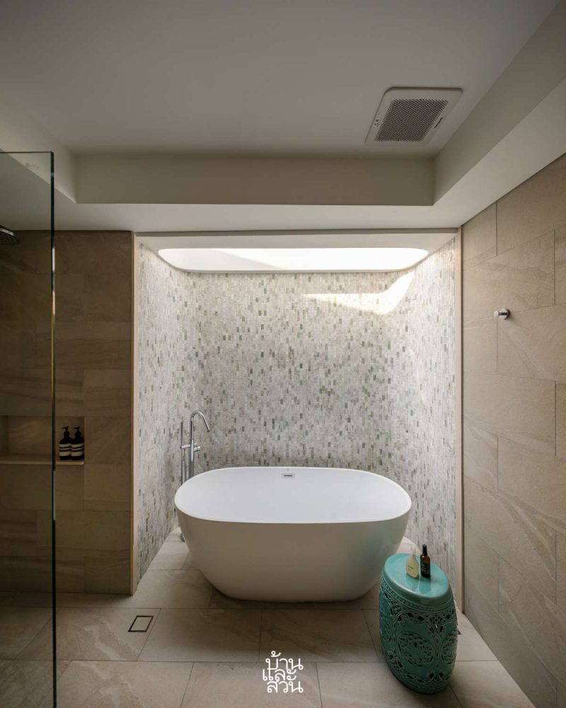 โซนอาบน้ำแยกออกจากส่วนอื่นของห้องน้ำด้วยผนังลายหินที่เลือกใช้วัสดุต่างกัน เพิ่มมิติให้พื้นที่ดูชัดเจนยิ่งขึ้น ความพิเศษอยู่ที่ช่องแสงสกายไลต์ทรงโค้ง ซึ่งล้อกับเส้นสายของอ่างอาบน้ำ ช่วยนำแสงธรรมชาติเข้ามาสร้างบรรยากาศที่เปลี่ยนแปลงตามช่วงเวลา พร้อมทั้งลดความอับชื้นและส่งเสริมสุขภาวะที่ดี