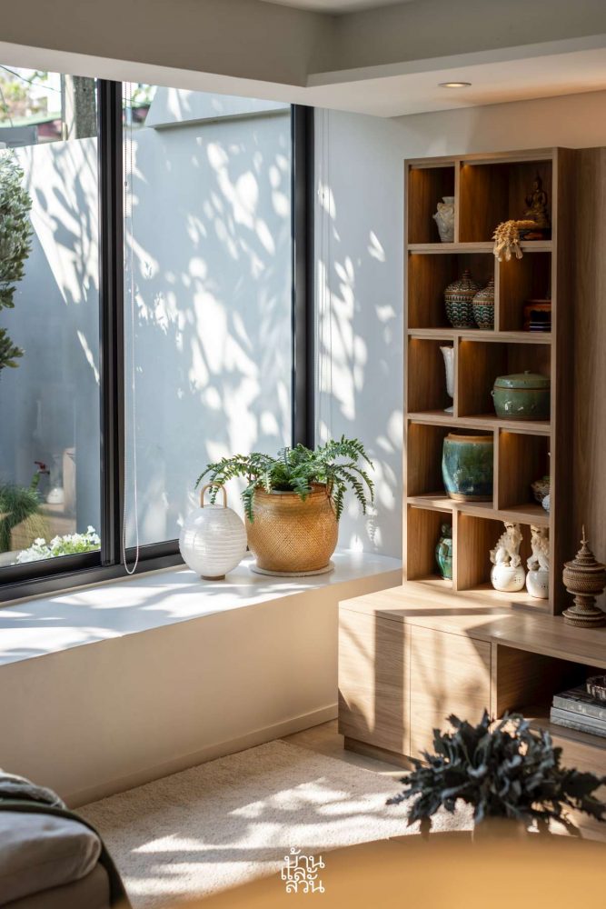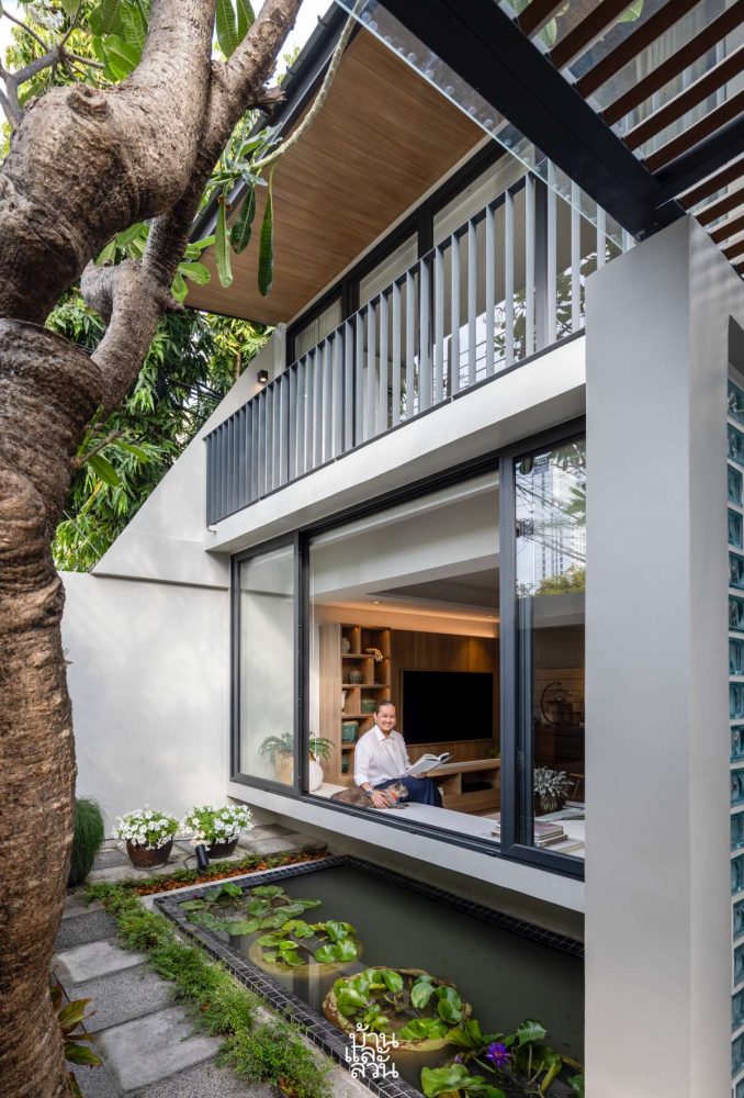“เราต่อขยายทั้งด้านหน้าและด้านหลังบ้านเพื่อเพิ่มพื้นที่และนำแสงธรรมชาติเข้ามาในบ้าน โดยออกแบบให้พื้นที่นั่งเล่นซึ่งติดกับริมหน้าต่างยื่นออกไปเล็กน้อย เข้าใกล้บ่อน้ำและต้นไม้ด้านหน้า กลายเป็นมุมเบย์วินโดว์บรรยากาศดี ร่มรื่นด้วยร่มเงาจากต้นไม้”