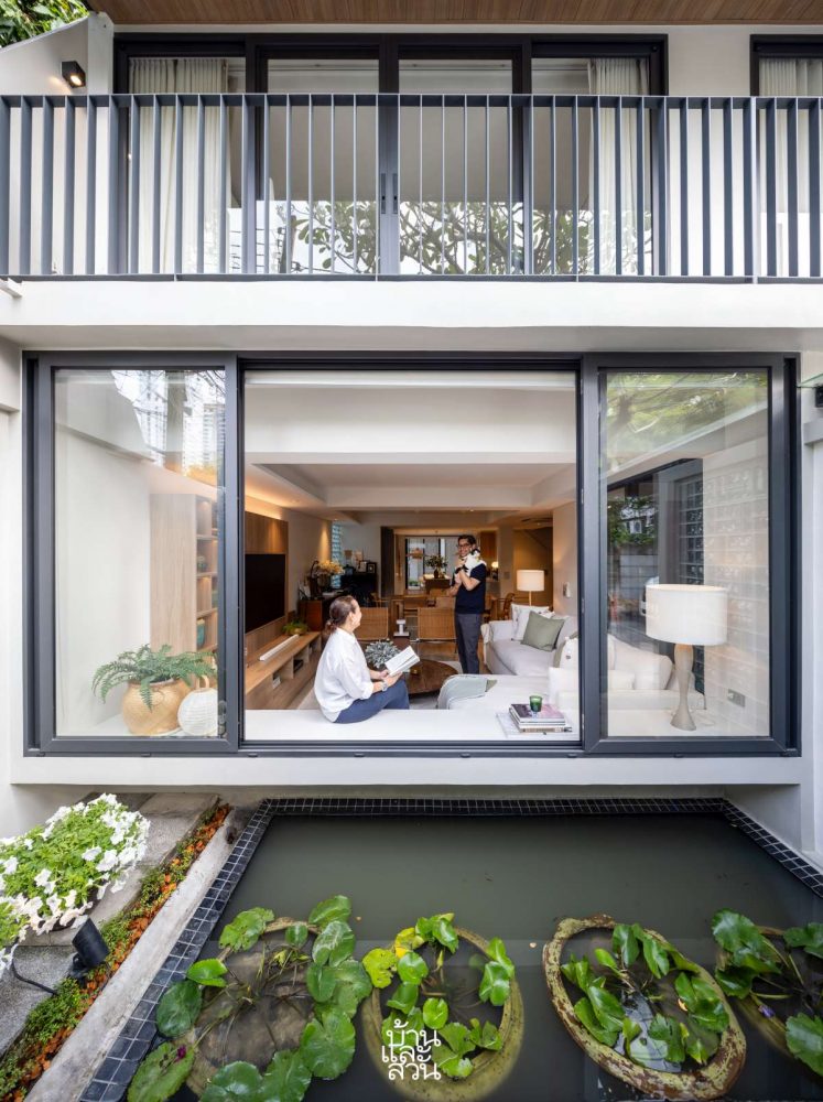 พื้นที่นั่งเล่นออกแบบเป็นบานเลื่อนกระจก จึงสามารถเปิดโล่งรับไอลมเย็นที่พัดผ่านน้ำ และเปิดรับ แสงธรรมชาติได้อย่างเต็มที่