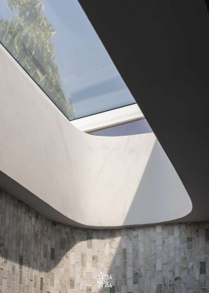 สกายไลต์โซนอาบน้ำ เนื่องจากในห้องน้ำมีช่องแสงน้อยและอาจเกิดความอับชื้น จึงออกแบบให้ด้านบน สกายไลต์เป็นกระจกใส ติดตั้งบนโครงอะลูมิเนียม