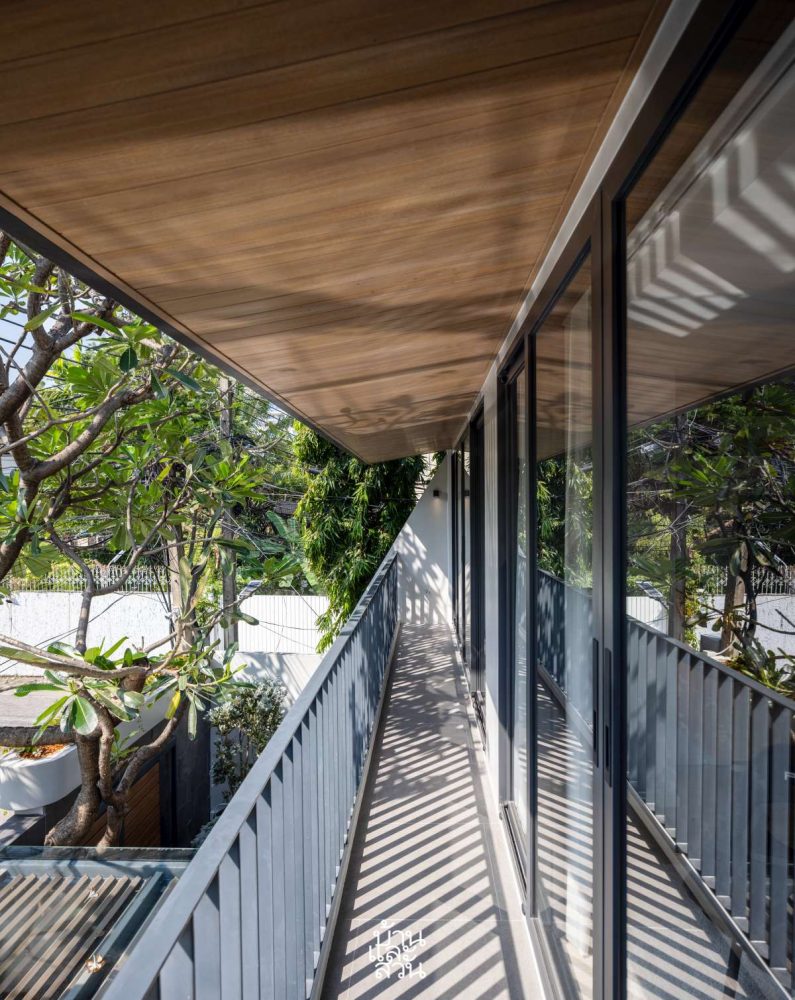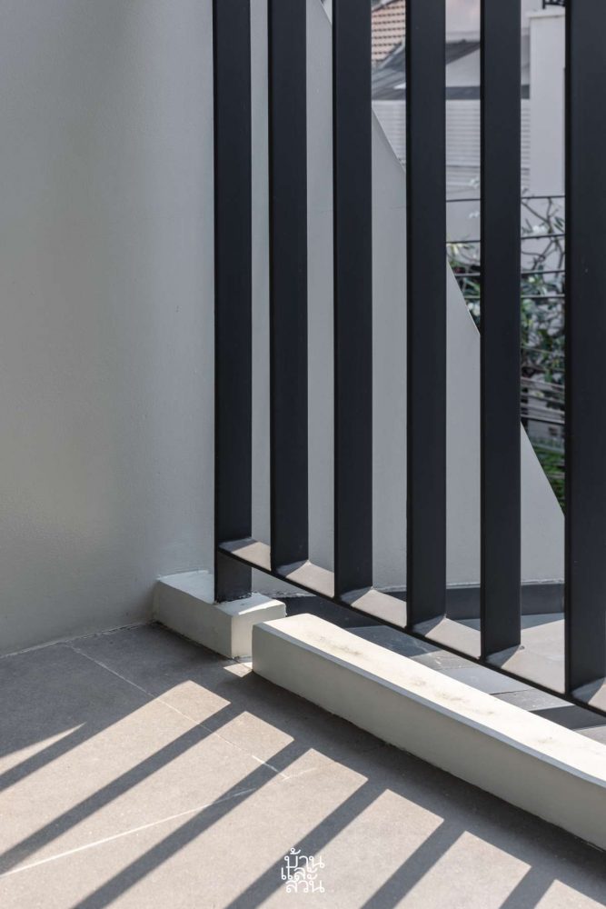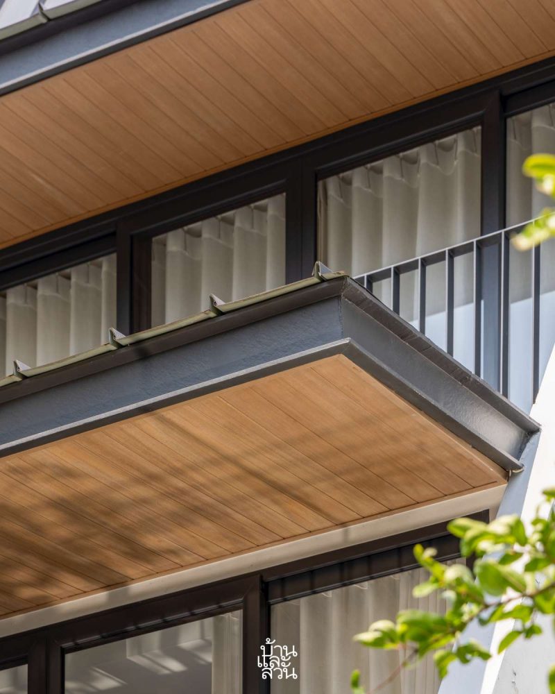 พื้นที่ระเบียงภายนอกภายใต้ชายคากรุไม้เทียม และออกแบบราวกันตกแบบโปร่ง ช่วยเพิ่มความกว้างให้ระเบียงและได้ลูกเล่นจากแสงเงาที่ทอดผ่านเข้ามา
