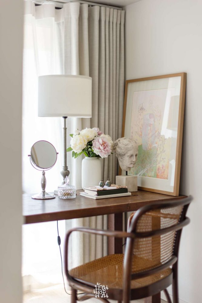 โต๊ะมุมนั่งเล่นตัวนี้เต็มไปด้วยเรื่องราว ตั้งแต่เคยเป็นโต๊ะทำงานสมัยเรียน เมื่อมีครอบครัวก็กลายเป็นที่เปลี่ยนผ้าอ้อมให้ลูก จนเมื่อลูกโตขึ้น โต๊ะตัวเดิมก็กลายเป็นที่ทำการบ้าน และปัจจุบันกลายมาเป็นโต๊ะอนกประสงค์ในห้องนอน ใช้ทั้งอ่านหนังสือและแต่งหน้าของภรรยา