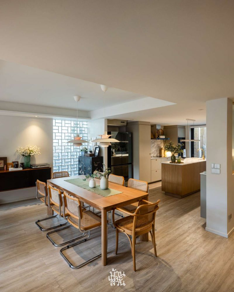 บริเวณรับประทานอาหารเลือกใช้บล็อกแก้วใสในบางส่วนของผนัง เพื่อเปิดรับแสงธรรมชาติและ เติมความโปร่งให้พื้นที่กลางบ้าน