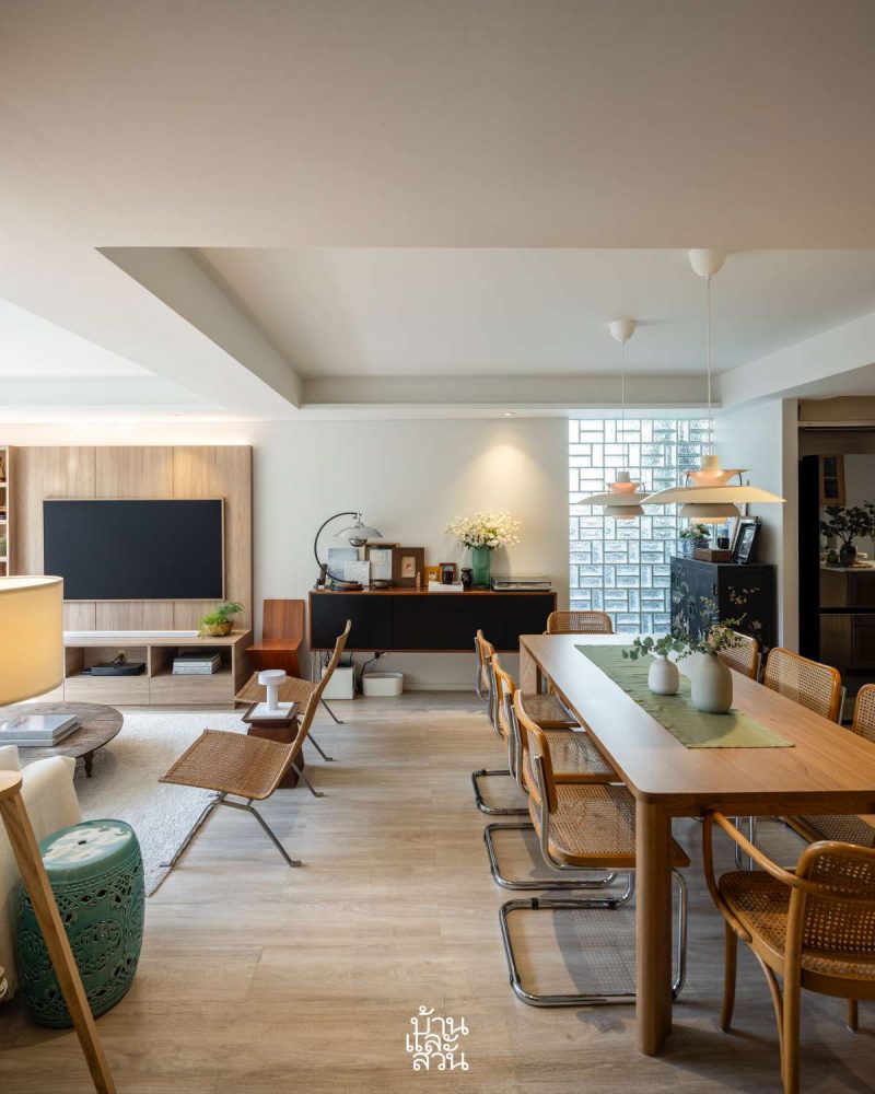 พื้นที่ชั้นล่างออกแบบแบบโอเพ่นแปลน เปิดให้ทุกมุมเชื่อมต่อถึงกันอย่างไหลลื่น ตกแต่งด้วยเฟอร์นิเจอร์ โทนสีไม้เป็นหลัก และแทรกสีสันเป็นกิมมิกเล็ก ๆ เพิ่มชีวิตชีวา