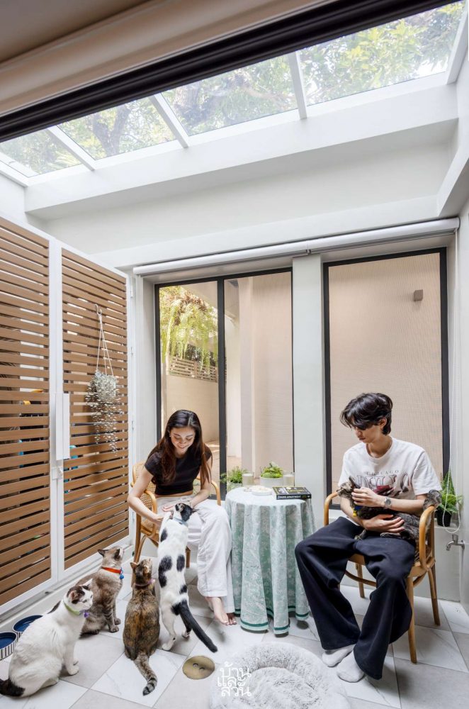 ระเบียงหลังบ้านออกแบบให้มีหลังคาสกายไลต์ ช่วยให้พื้นที่ดูโปร่งสบายแม้มีขนาดจำกัด ในบางวันจึงกลายเป็นมุมนั่งเล่นอีกมุมของบ้าน ขณะที่อีกด้านเป็นพื้นที่งานระบบที่พรางสายตาไว้ด้วยระแนงไม้เพื่อความเป็นระเบียบและสวยงาม
