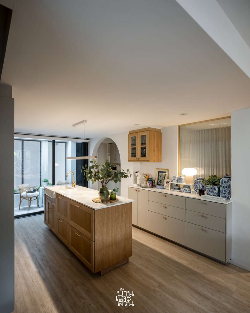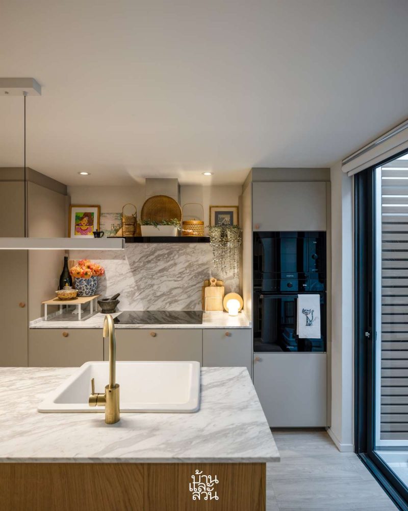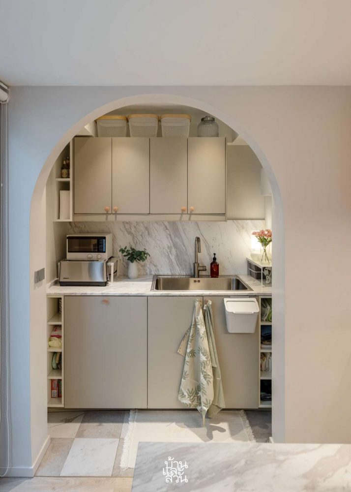 ครัวขนาดกะทัดรัดที่ออกแบบให้ใช้งานได้จริง พร้อมเคาน์เตอร์กลางสำหรับเตรียมอาหาร พื้นที่ตกแต่งด้วยวัสดุในโทนเบจ ครีม และไม้ ตัดด้วยหินสีขาว ช่วยเติมบรรยากาศอบอุ่นให้ครัวเล็ก ๆ มุมนี้น่าใช้งานยิ่งขึ้น