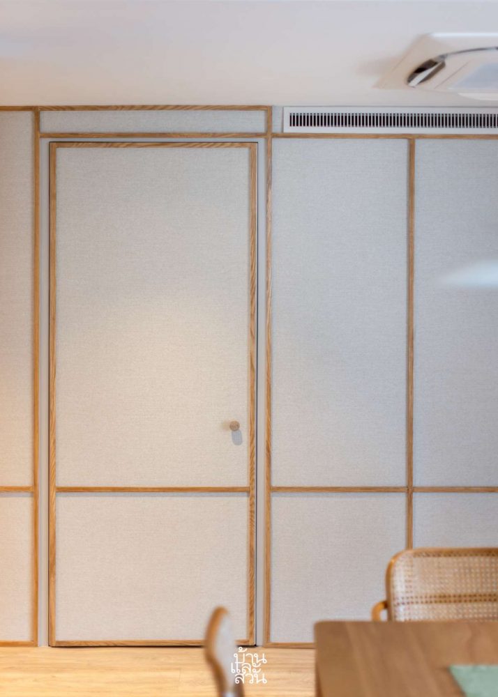 ห้องเก็บของชั้นล่าง ออกแบบให้แนบเนียนไปกับการตกแต่งภายในด้วยการติดวอลล์เปเปอร์สีเท่าอ่อนและตีโครงไม้เป็นแพตเทิร์นเรียบง่าย พร้อมออกแบบให้ด้านบนเป็นช่องระบายอากาศเพื่อให้ ห้องเก็บของด้านในยังคงสามารถ ระบายอากาศได้ดี