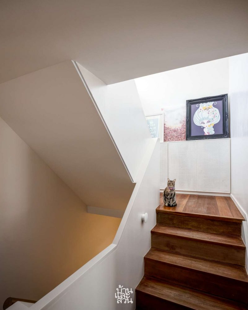 โถงบันไดยังคงตำแหน่งเดิมไว้ และใช้พื้นไม้เดิม พร้อมออกแบบให้พื้นที่เป็นสีขาวต่อเนื่องขึ้นไปถึงชั้นบน ด้วยราวกันตกและตู้เก็บของ สร้างความกลมกลืนไปกับผนังโดยรอบ