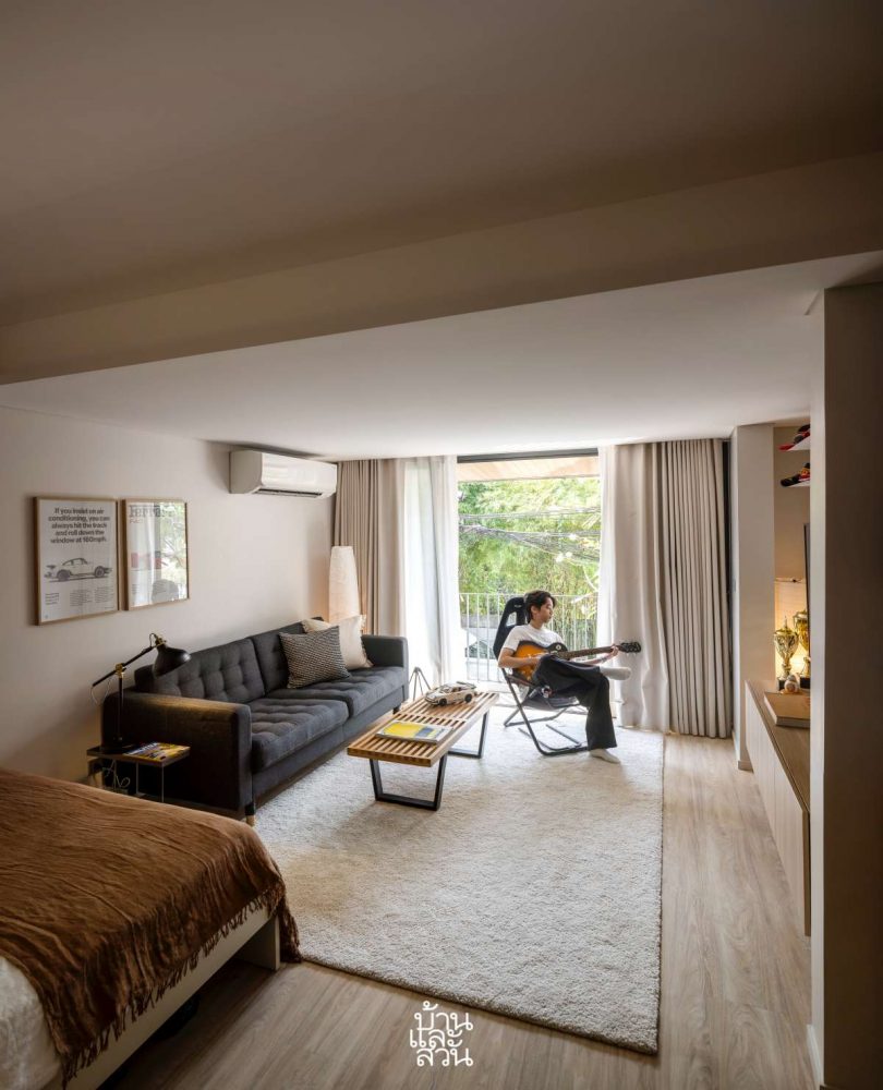 ดังนั้นพื้นที่ห้องนอนบริเวณชั้น 2 และ 3 ที่แต่เดิมค่อนข้างอึดอัด จึงขยับขยายออกไปในระยะเพียง 50 เซนติเมตร โดยยอมลดความกว้างของระเบียงลง เพื่อให้พื้นที่ใช้สอยภายในเพียงพอก่อน และออกแบบให้ตลอดแนวผนังเป็นบานเลื่อนกระจก ที่สามารถเปิดโล่งได้ตามต้องการ ห้องจึงแลดูสว่าง ไม่อึดอัด ในขณะเดียวกันก็ยังมีชายคาเดิมช่วยกรองเฉดของแดดไม่ให้ส่องเข้ามาด้านในมากจนเกินไป