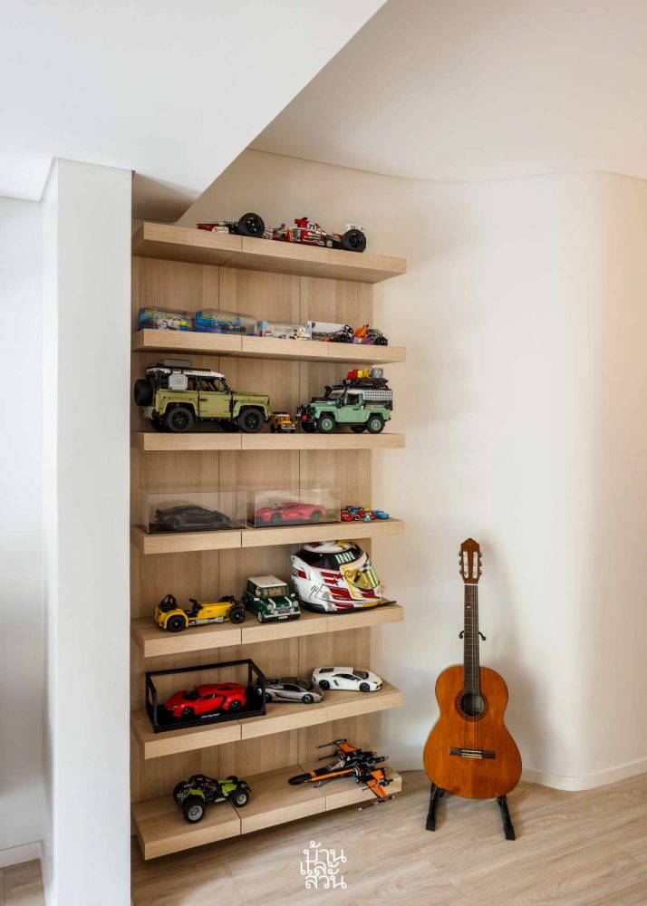 ห้องนอนลูกชายจัดโซนเหมือนโรงแรมเช่นเดียวกัน แต่สอดแทรกบุคลิกที่แตกต่างเข้าไปด้วยการใช้ เฟอร์นิเจอร์โทนสีเข้ม และมุมชั้นวางบิลท์อินไม้ที่วางของสะสมของลูกชายที่ชื่นชอบรถ