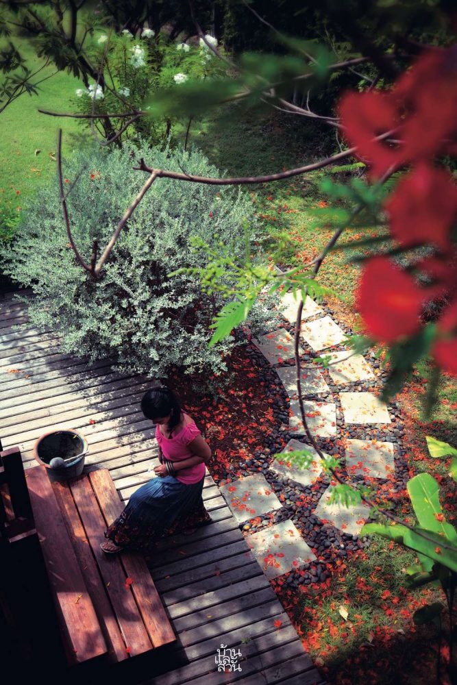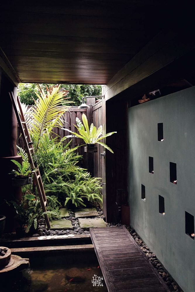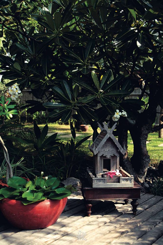 ลมที่พัดมาเอื่อยๆทำให้กิ่งไม้ด้านนอกเอนไหวเบาๆ ตอนนี้แสงแดดได้เข้ามาแทนที่ลมฝนแล้ว คุณแกรี่จึงชวนเราเดินดูรอบๆบ้าน ด้วยความที่คุณแกรี่อยู่เมืองไทยมานานและรักความเป็นเอเชีย เขาจึงศึกษาข้อมูลเกี่ยวกับบ้านไทยและการตกแต่งสไตล์โอเรียนทัล สังเกตได้จากภายในตู้หนังสือซึ่งเต็มไปด้วยหนังสือเกี่ยวกับการตกแต่งสไตล์นี้