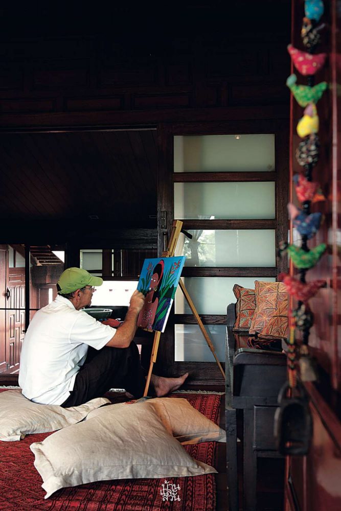 ดอกสีแดงสวยของต้นหางนกยูงต้นใหญ่ซึ่งปลูกได้ไม่นานแต่ก็โตไวร่วงหล่นอยู่บนบันไดที่นำเราขึ้นไปสู่ชั้นสองของบ้าน พ้นบันไดมีลานนั่งเล่นเล็กๆแบบบ้านไทยโบราณเปิดโล่งรับลมก่อนเข้าห้องนอนใหญ่และห้อง รับแขก เราแอบเห็นภาพวาดสีสดสไตล์จาเมกาที่ยังวาดไม่เสร็จ แววตาสดใสแฝงความสุขของนางแบบในภาพทำให้เราอมยิ้มอยู่ในใจ เมื่อคุณเอ๋ยเห็นภาพนี้ก็หันไปถามคุณแกรี่ว่าเมื่อไรจะวาดรูปนี้เสร็จ พร้อมบอกให้วาดหน้าสวยๆ คุณแกรี่เลยหันมาบอกเราว่าเขาชอบวาดภาพเป็นงานอดิเรกและยังรักการถ่ายภาพด้วย