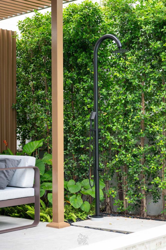 outdoor shower เลือกใช้แบบเสาให้มีความเพรียวบาง ดูกลมกลืนไปกับบรรยากาศพื้นที่สวนด้านข้าง