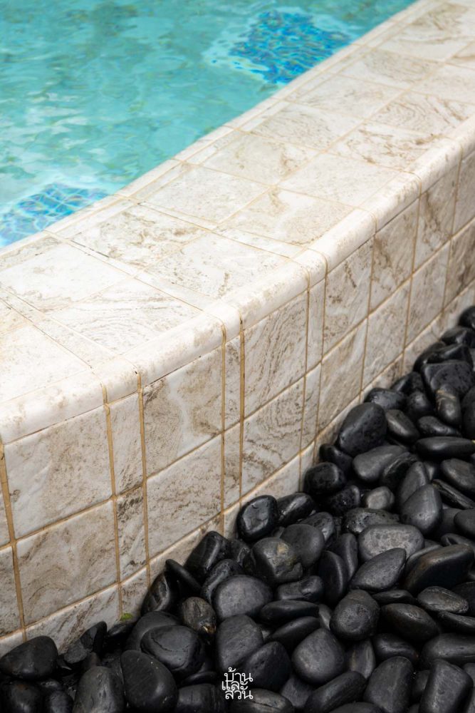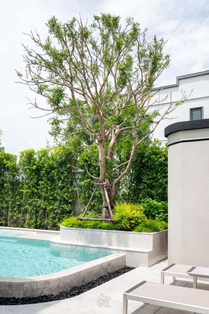 ถัดมาเป็นพื้นที่สระว่ายน้ำแบ่งออกเป็น 3 โซนหลัก ได้แก่ สระผู้ใหญ่ สระเด็ก และมุม Jacuzzi สำหรับนั่งแช่น้ำผ่อนคลายในวันสบาย ๆ ทางทีมเลือกใช้วัสดุเป็นกระเบื้องลายหินสีครีมขนาด 10×10 เซนติเมตร เพื่อให้ภาพรวมดูสว่างและเมื่อน้ำในสระสะท้อนแสงแดดจะระยิบระยับเป็นสีฟ้าใส อีกทั้งยังเลือกใช้เส้นโค้งลบมุม (fillet) สำหรับขอบสระและกระบะต้นเสม็ดแดงฟอร์มสวย เพื่อเพิ่มมิติและความลื่นไหลต่อเนื่องกับขอบอาคาร รวมถึงติดตั้งกำแพงน้ำตกในสไตล์โมเดิร์น เพื่อเพิ่มเสียงน้ำไหลเบา ๆ ทำให้บรรยากาศในสวนรู้สึกผ่อนคลายและสดชื่นมากยิ่งขึ้น