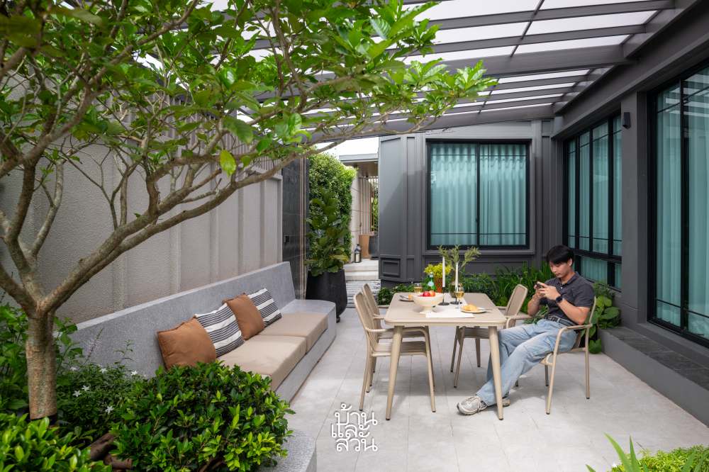พื้นที่ใช้งานหลังบ้านสามารถปรับเปลี่ยนให้เหมาะกับจำนวนคนและกิจกรรมได้ ไม่ว่าจะเป็นการนั่งพักผ่อนหย่อนใจ อ่านหนังสือ เล่นโยคะ หรือไว้แฮงค์เอาต์กับเพื่อน ๆ และครอบครัว