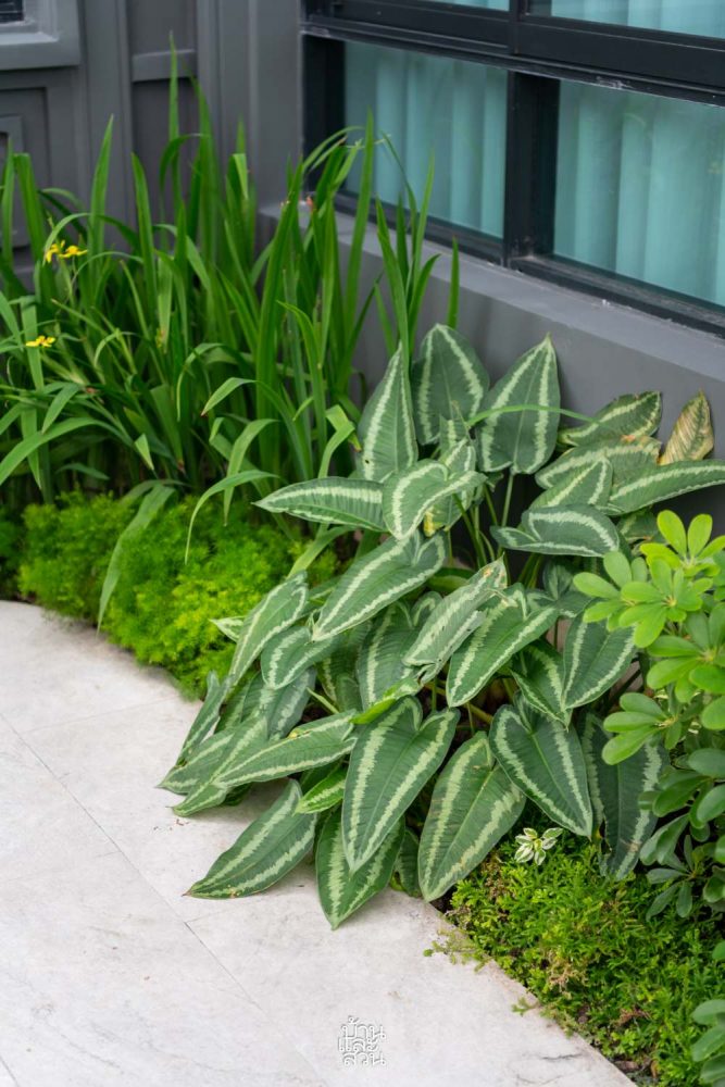เนื่องจากมีพื้นที่ปลูกต้นไม้จำกัด ทางทีมจึงเลือกใช้พรรณไม้ในร่มหลากหลายชนิด ให้รูปทรงใบและโทนสีสร้างความแตกต่าง เพิ่มมิติให้สวนดูสมบูรณ์มากขึ้น