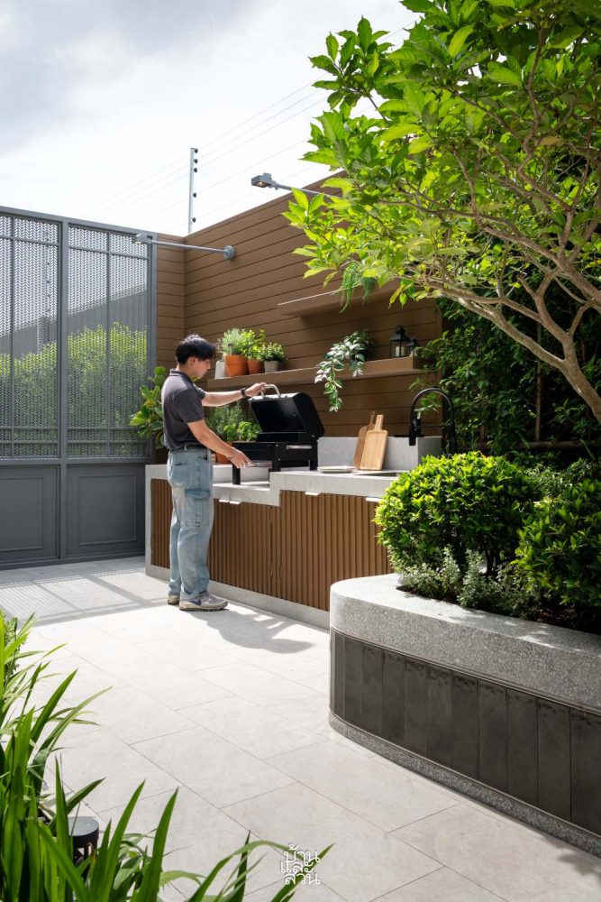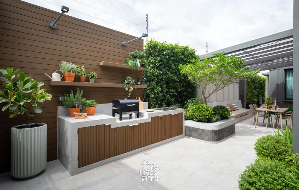 การใช้งานของโซนหลังบ้านสามารถเดินเชื่อมต่อจากตัวบ้านด้านหลังได้สะดวก เป็นพื้นที่สำหรับนั่งเล่นหรือจัด PARTY BBQ ต้อนรับครอบครัวหรือเพื่อน ๆ ที่แวะเวียนมาประมาณ 6-8 คน โดยพื้นที่แบ่งออกเป็น 2 ส่วนหลัก ได้แก่มุมรับประทานอาหารกลางแจ้ง ทีมงานได้ออกแบบให้เป็นม้านั่งยาวแบบบิล์ทอินติดกำแพงด้านข้าง เพื่อเปิดพื้นที่ตรงกลางไว้สำหรับจัดวางชุดโต๊ะทานอาหารภายนอก พร้อมเลือกใช้ผ้าและวัสดุสำหรับงาน outdoor ที่มีความทนทาน แห้งเร็ว และทำความสะอาดได้ง่าย ส่วนด้านข้างที่อยู่ติดกันจะเป็นมุมเคาน์เตอร์ BBQ โดยตัวเคาน์เตอร์จะถูกจัดสรรไว้สำหรับการเตรียมอาหาร และชิงค์ล้างจาน ด้านใต้ยังออกแบบให้เป็นหน้าบานแบบปิดที่ไว้ใช้เก็บอุปกรณ์ต่าง ๆ ให้ดูเรียบร้อย นอกจากนี้ ผนังตกแต่งด้านหลังได้เพิ่มลูกเล่นและฟังก์ชันเป็นชั้นวางของที่สามารถจัดวางกระถางสำหรับปลูกผักสวนครัวหรือกระถางไม้เลื้อย เพื่อเสริมบรรยากาศให้มุมนี้ดูมีชีวิตชีวามากยิ่งขึ้น