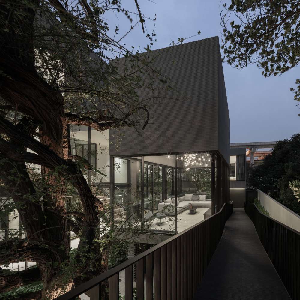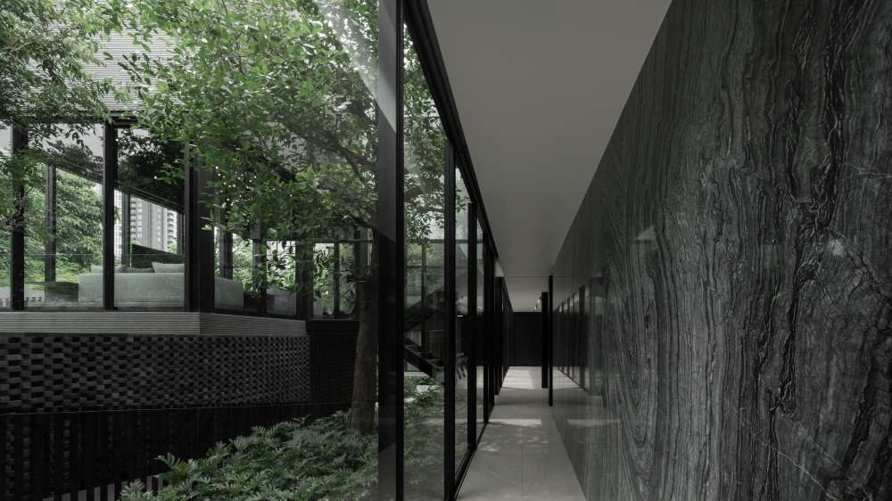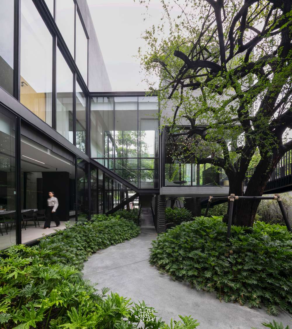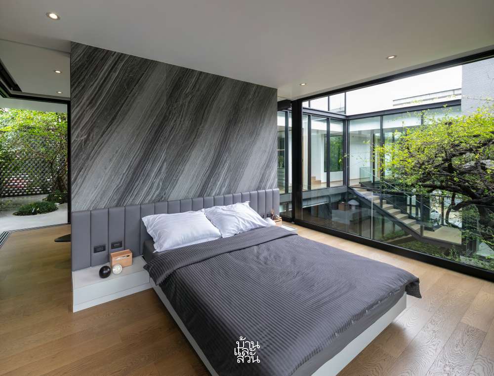 ด้วยดีไซน์เป็นผนังกระจกโดยรอบ จึงสามารถมองเห็นต้นไม้น้อยใหญ่แบบทะลุปรุโปร่ง ห้องต่างๆ ที่วางตัวล้อมรอบคอร์ตกลางก็สามารถมองเห็นห้องนั่งเล่นที่แทรกตัวอยู่ท่ามกลางสวนได้อย่างชัดเจน สวนและลู่วิ่งจึงกลายเป็นตัวกลางเชื่อมสายตาและความสัมพันธ์ระหว่างสมาชิกในบ้าน ทำให้ทุกคนสามารถมองเห็นและรับรู้ถึงกันและกันได้อยู่เสมอ ผ่านมุมมองที่เปิดเชื่อมถึงกันอย่างเป็นธรรมชาติ