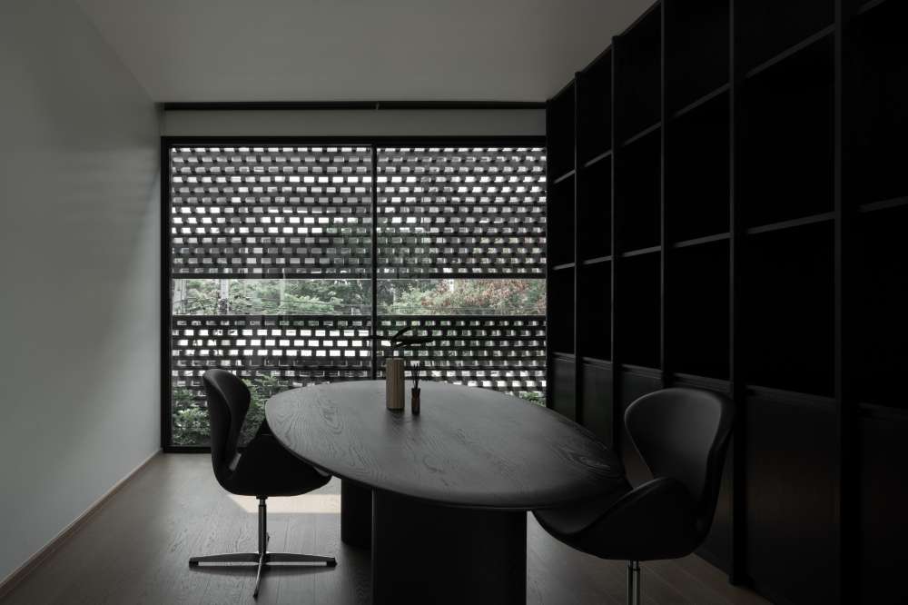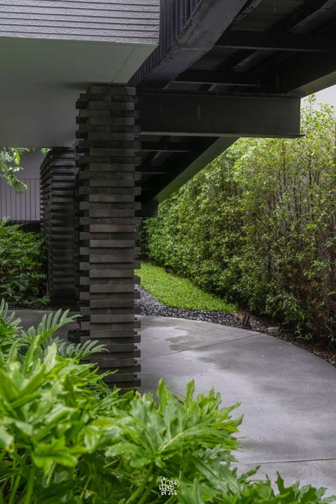 จะดีแค่ไหนถ้ามีบ้านที่ให้เราสามารถวิ่งออกกำลังกายได้ในทุกวัน เบื้องหน้าฟาซาดและรั้วสีเข้มที่ปิดทึบ บ้านสีเข้ม หลังนี้จึงสะท้อนบุคลิกเรียบง่าย และเสมือนค่อยๆ ปลีกตัวออกจากความวุ่นวายภายนอก แสดงให้เห็นถึงการปรับตัวเข้ากับบริบทโดยรอบที่เต็มไปด้วย มลภาวะทางเสียง เนื่องจากที่ดินค่อนข้างติดกับทางด่วนและสะพานขนาดใหญ่ จึงเป็นที่มาของบ้านที่ดูเคร่งขรึม แต่แท้จริงแล้วแอบซ่อนพื้นที่สีเขียวเอาไว้ภายใน เปรียบเสมือนโอเอซิสใจกลางบ้าน โดยแทรก แนวคิดสนุกๆ ที่น่าสนใจอย่าง “ลู่วิ่ง” รอบบ้านเอาไว้อีกด้วย