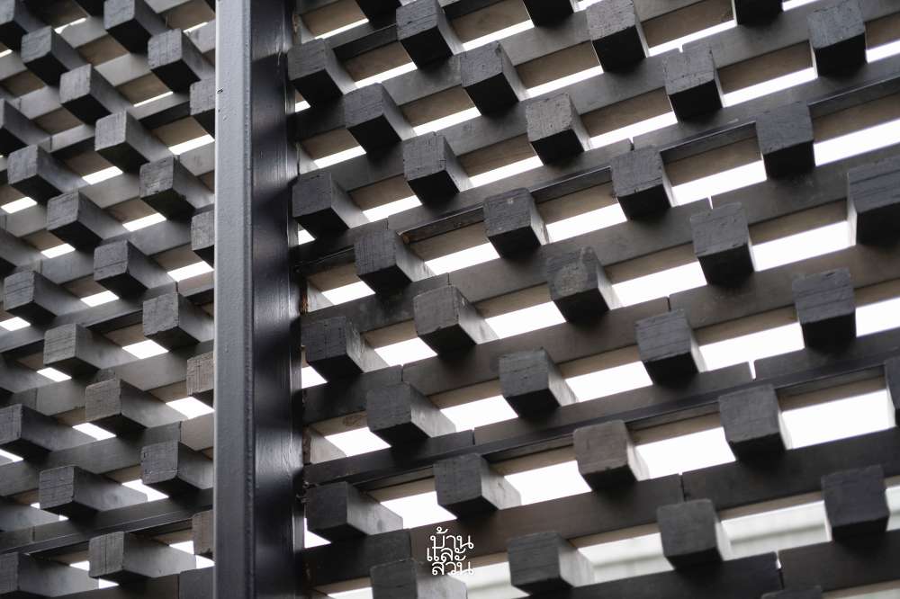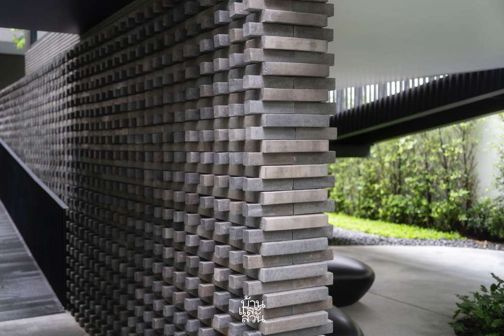 “อิฐมอญนำมาติดตั้งบนโครงคร่าวเหล็กและสานเหล็กประกบด้านหลังเพื่อยึด เนื่องจากอิฐ ค่อนข้างเจาะได้ยาก โดยเลือกใช้โครงเป็นเหล็กทำสีดำเพื่อให้แนบเนียนไปกับอิฐสีเทาเข้ม และเว้นช่อง โปร่งกึ่งกลางฟาซาดไว้ในระดับสายตายาวตลอดแนว สามารถมองเห็นจากชั้น 2 ของบ้านได้ ไม่เพียงแต่ ช่วยเฟรมมุมมองให้เห็นภายนอกบางส่วนเท่านั้น แต่ยังเป็นการช่วยลดทอนความทึบตันของอาคาร และทำให้ภายนอกบ้านแลดูมีมิติ น่าสนใจมากยิ่งขึ้นอีกด้วย”