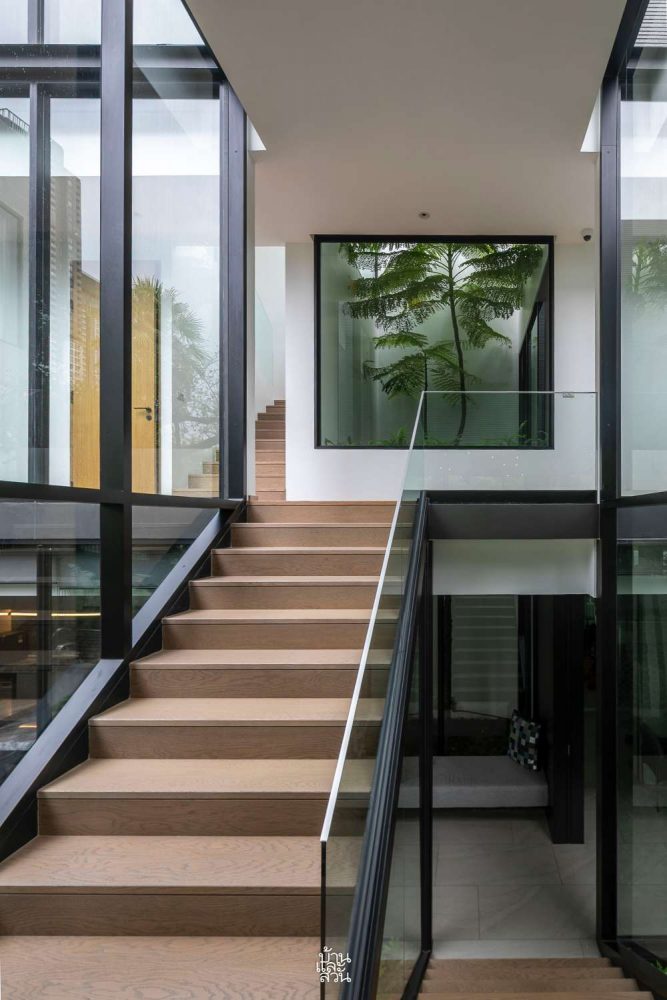 เมื่อก้าวขึ้นสู่ชั้น 2 ประสบการณ์ระหว่างทางถูกออกแบบให้เต็มไปด้วยความรู้สึกของการอยู่ท่าม กลางธรรมชาติ โถงบันไดกระจกที่แทรกตัวอยู่ระหว่างสวนสองฝั่ง สร้างความรู้สึกเหมือนถูกโอบล้อมด้วย พื้นที่สีเขียวตลอดการเดินทางขึ้นสู่ชั้นบน และเมื่อเดินมาถึงบริเวณโถงบันไดก่อนเข้าสู่พื้นที่ใช้สอยหลัก ในชั้น3 สายตาจะถูกนำพาไปยังต้นไม้ที่ปลูกไว้ในคอร์ตเล็กๆ ด้านหน้า โดยมีช่องแสงสกายไลต์ช่วยดึงแสง ธรรมชาติเข้ามาในตัวบ้านอย่างพอเหมาะ ทุกย่างก้าวภายในบ้านจึงให้ความรู้สึกเหมือนได้เดินอยู่ ท่ามกลางสวนหย่อมส่วนตัว