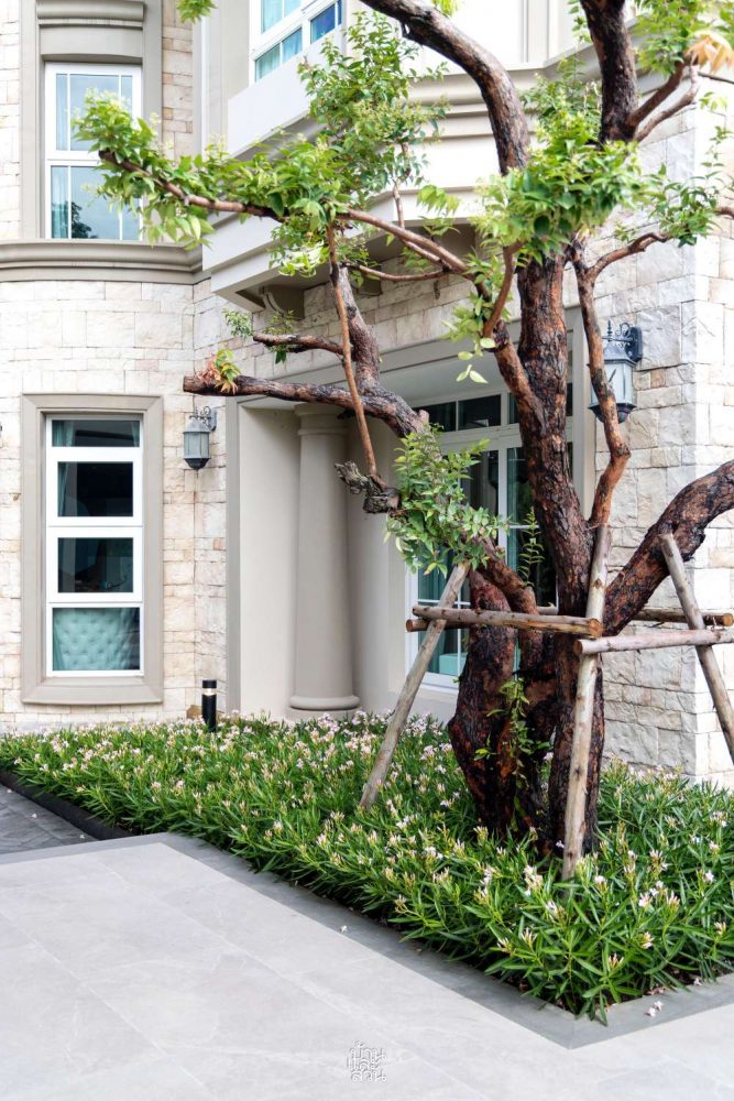 สวนที่ดีควรเลือกและจัดวางองค์ประกอบให้สอดคล้องกับผู้อยู่อาศัยและขนาดของพื้นที่บ้าน เพื่อให้ใช้งานได้สะดวก และไม่เกินกำลังในการดูแล เช่น การเลือกใช้พรรณไม้ที่ดูแลง่าย ทนแล้ง โตช้า และไม่ต้องตัดแต่งบ่อย อย่าง หมากผู้หมากเมีย พลูด่าง ซานาดู ลิ้นมังกร บัวดิน หญ้าเบอร์มิวดา หรือเศรษฐีเรือนใน โดยอาจเน้นการปลูกลงดินมากกว่าลงกระถาง เพราะดินสามารถเก็บความชื้นได้นานกว่า จึงช่วยลดความถี่ในการรดน้ำ และไม่ต้องเปลี่ยนกระถางเมื่อต้นไม้โตจนรากแน่น อีกทั้งยังอาจเลือกใช้พืชชนิดเดียวกันหรือมีความต้องการใกล้เคียงกันในแต่ละกลุ่มหรือแปลงปลูก เพื่อให้ดูแลง่าย ไม่ต้องแยกวิธีรดน้ำหรือแบ่งการใส่ปุ๋ย นอกจากนี้ รายละเอียดการออกแบบ อย่าง การยกแปลงผักให้สูงในระดับที่เอื้อมถึงได้ง่ายโดยไม่ต้องก้มมาก ก็ช่วยลดอาการปวดหลังของคุณแม่ หรือผู้สูงอายุที่ชอบทำสวนได้