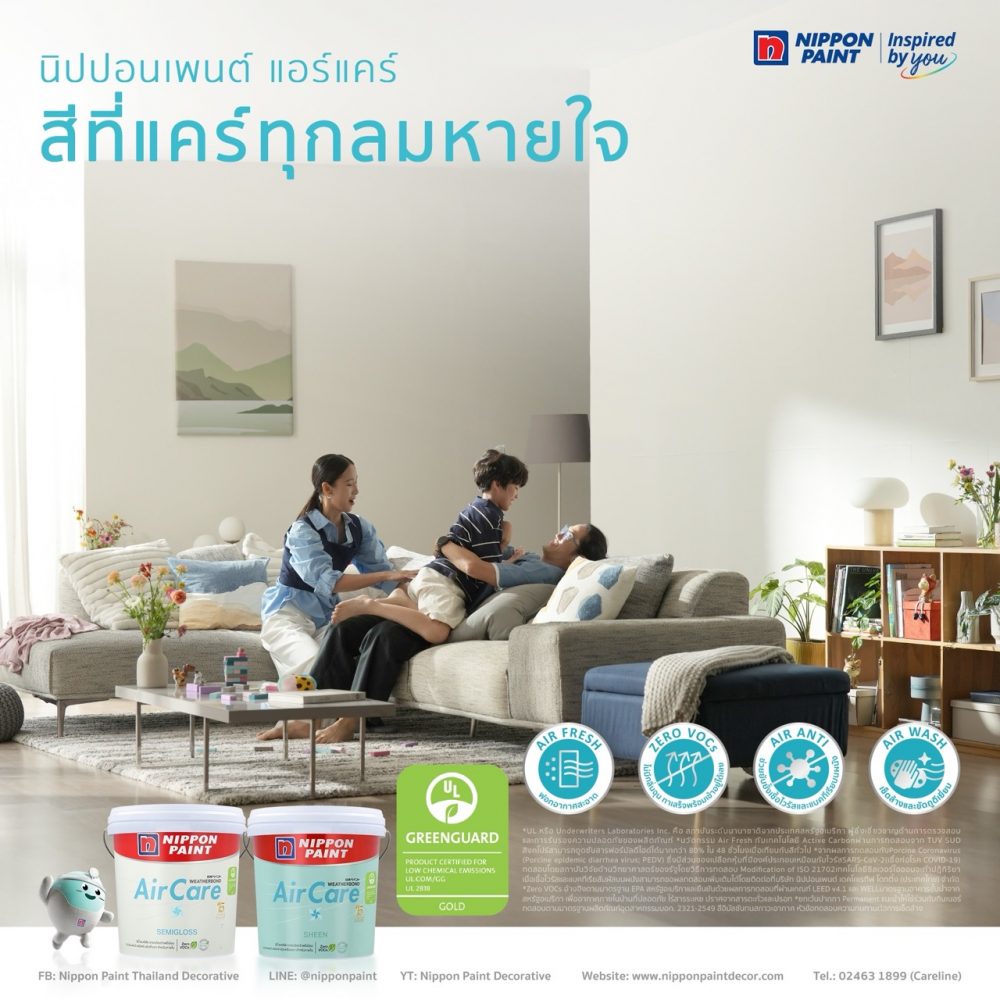 สวยครบจบด้วยสุขภาพ “นิปปอนเพนต์ แอร์แคร์” สีนวัตกรรมทาภายในเกรดอัลตร้าพรีเมียม เพื่อทุกชีวิตในบ้าน “นิปปอนเพนต์” แบรนด์สีนวัตกรรมยอดขายอันดับ 1 ของเอเชียจากประเทศญี่ปุ่น ย้ำภาพลักษณ์จุดยืนสำคัญของ “นิปปอนเพนต์แอร์แคร์” ( Nippon Paint AirCare) ในฐานะสุดยอดสีนวัตกรรมทาภายใน เพื่อสุขภาพเกรดอัลตร้าพรีเมียมรายแรกในไทย กับตรารับรองระดับโลก GREENGUARD GOLD จากสถาบัน UL สหรัฐอเมริกาการันตีอากาศภายในห่างไกลสารระเหย (Zero VOCs) เสมือนเป็นตัวช่วยผู้ดูแลอากาศในบ้านให้สะอาดกว่า เสริมสุขภาพที่ดีขึ้นให้กับทุกชีวิตกับคำมั่น “สีที่แคร์ทุกลมหายใจ”