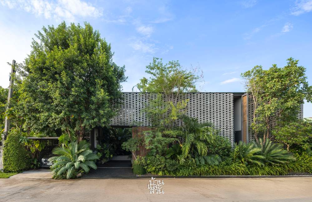 เพราะเจ้าของบ้านต้องการความรวดเร็วในการก่อสร้าง และสามารถปรับเปลี่ยนให้ยืดหยุ่นไปตามการออกแบบได้มาก จึงเลือกทำบ้านโครงสร้างเหล็ก โดยวางผังบ้านเป็นรูปตัวแอล (L) โอบสวนส่วนกลาง และวางแผนเก็บรักษาต้นไม้ใหญ่ที่อยู่มานานไว้ตลอดการก่อสร้าง เพื่อให้ต้นไม้มีรากที่หยั่งลึกลงดินอย่างแผ่กว้างและยืนเด่นแผ่กิ่งก้านออกไปให้ร่มเงาอย่างร่มรื่น ช่วยให้บ้านเย็นสบาย ตลอดจนเลือกใช้ผนังก่ออิฐช่องลมช่วยบังแสงแดด แต่ไม่บังลม มีชายคายื่นยาวเพียงพอกับการบังแดด และยกใต้ถุนสูงช่วยให้บ้านระบายความร้อนออกไปได้เร็วที่สุด จึงเป็นตัวอย่างที่ดีของบ้านที่ตั้งอยู่ในเขตร้อนชื้น >> ชมบ้านหลังนี้